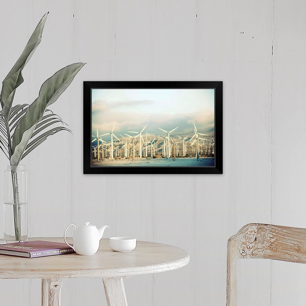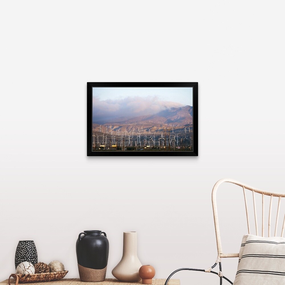 "Wind turbines with mountains in the background, Riverside County, California" Black Framed Print