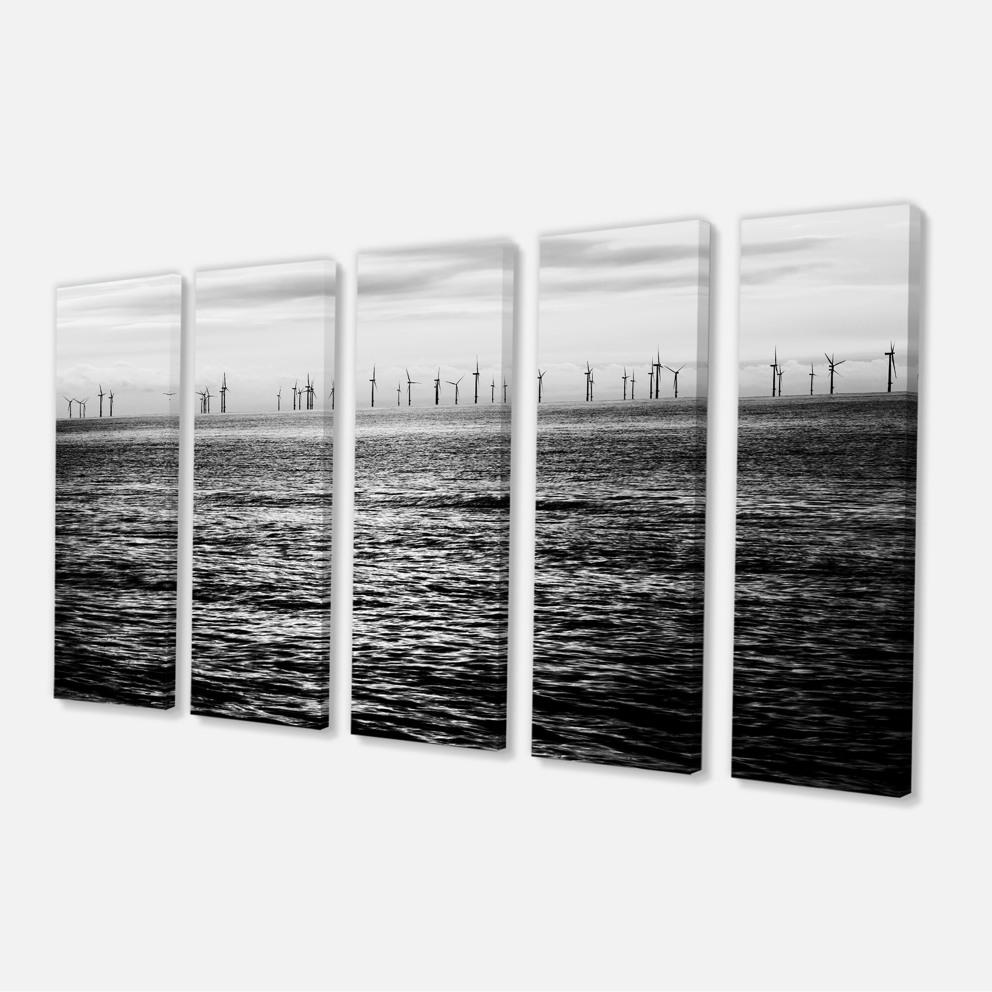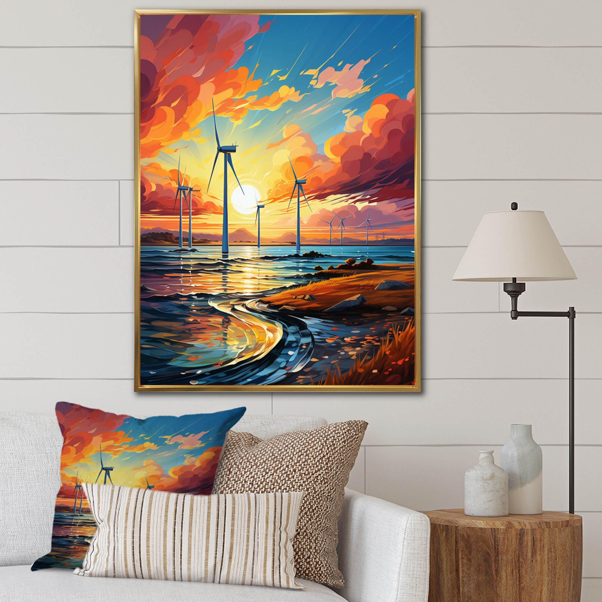 Designart "Wind Turbines Coastal Harvest" Wind Turbines Framed Wall Art Living Room