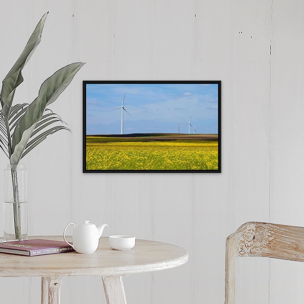"Yellow wildflowers cover field in rural Illinois. Wind turbines are lined up " Black Float Frame Canvas Art