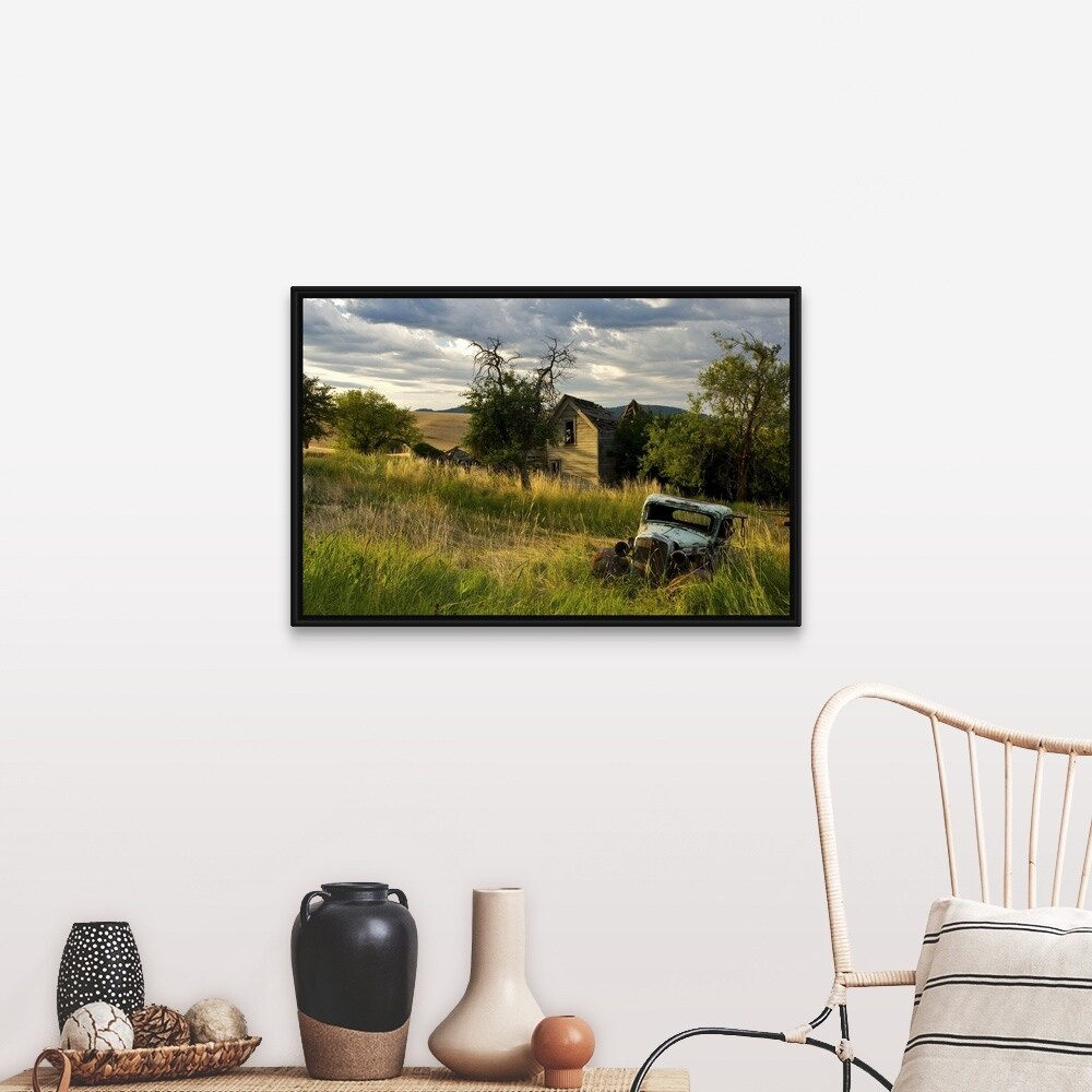 "Rustic truck in wheat field" Black Float Frame Canvas Art