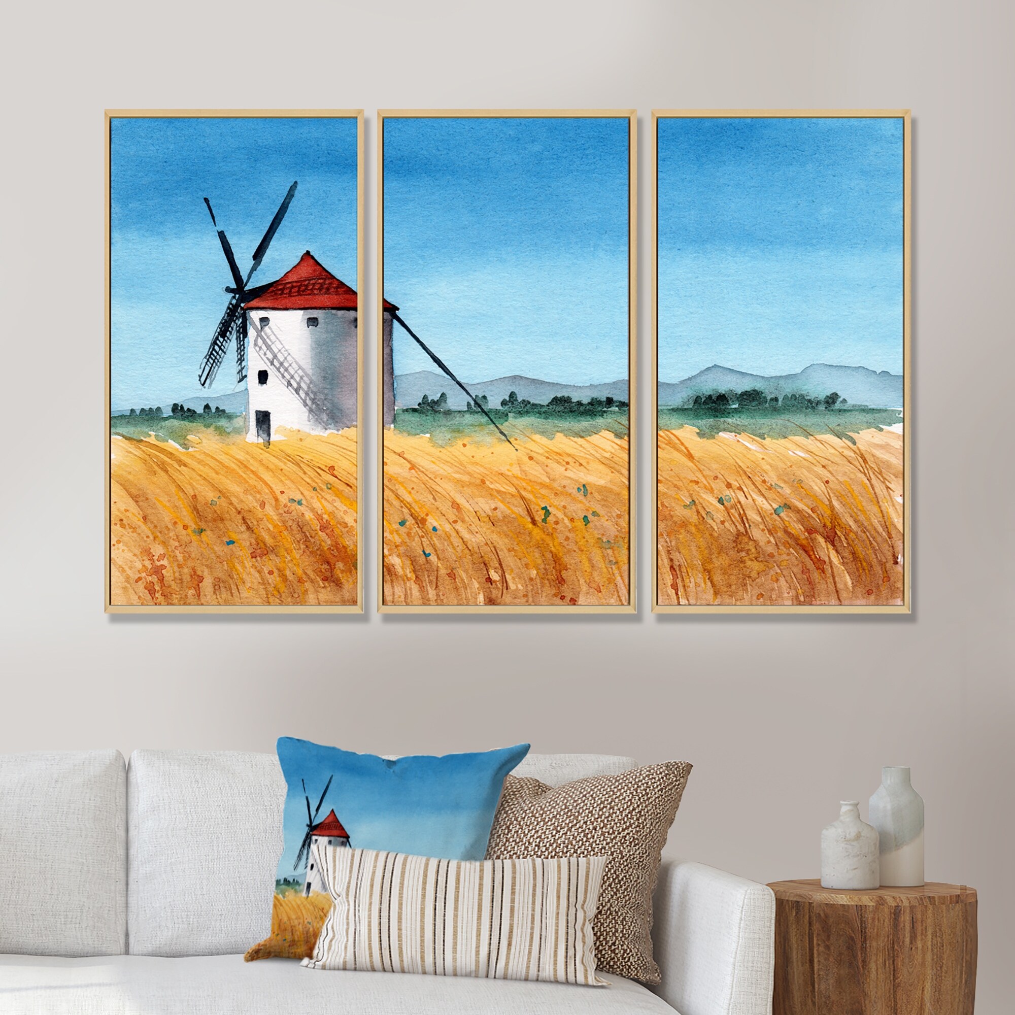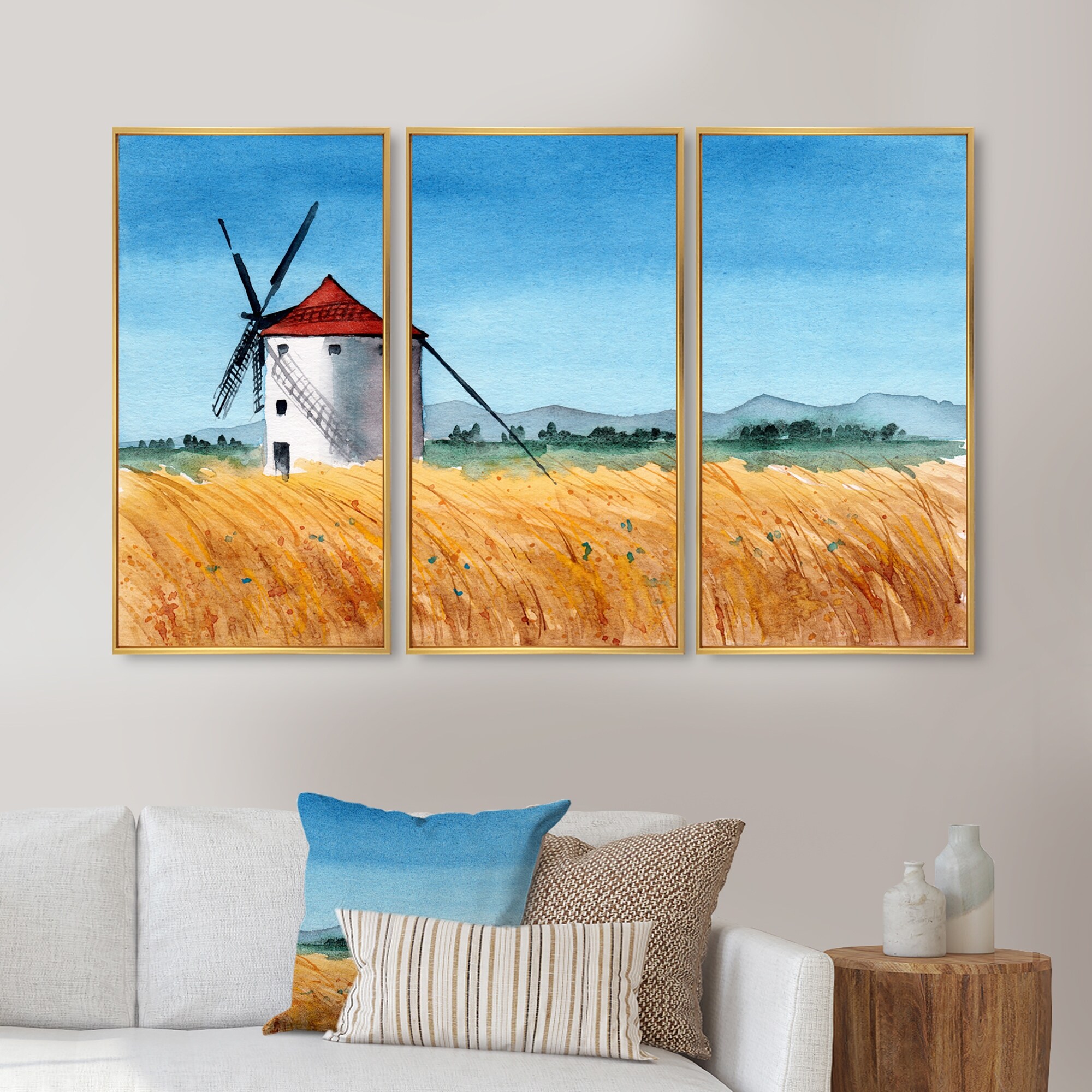 Designart "Landscape With A Windmill Standing in Wheat Field" Country Framed Wall Decor Set of 3 - 4 Colors of Frames