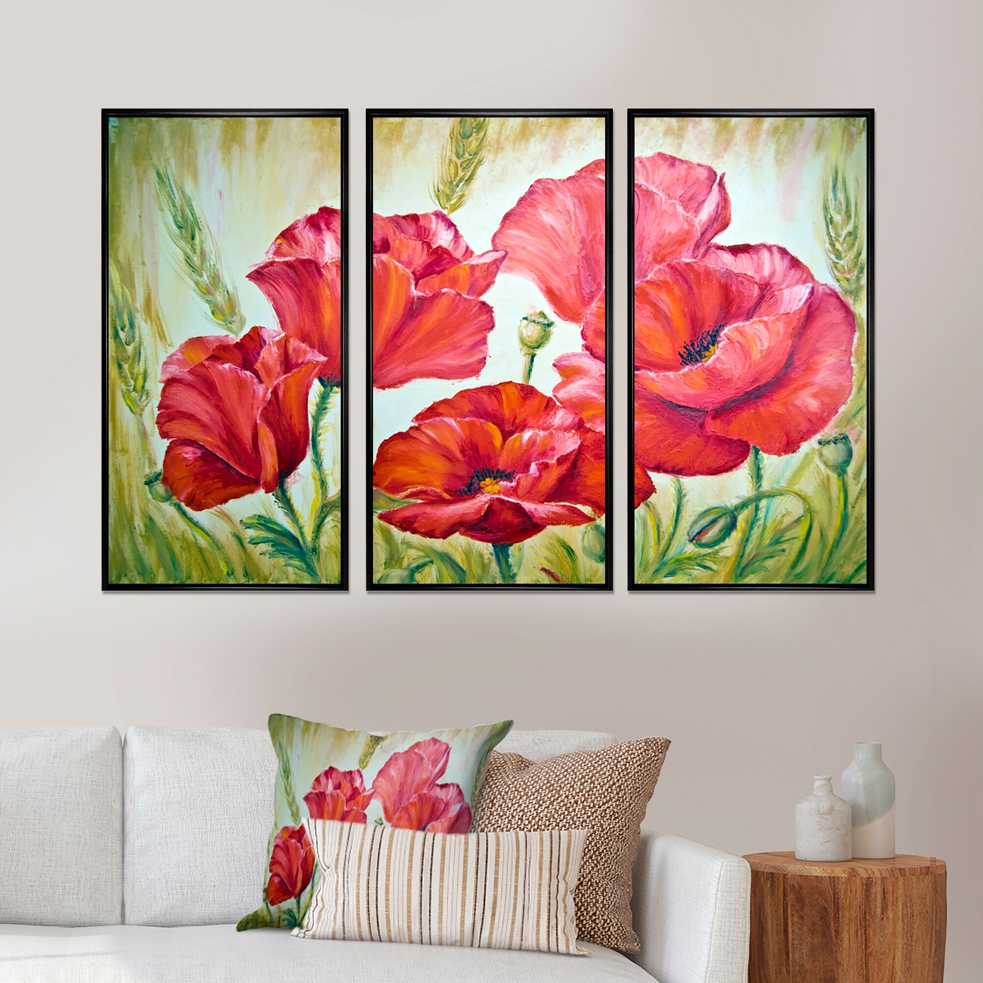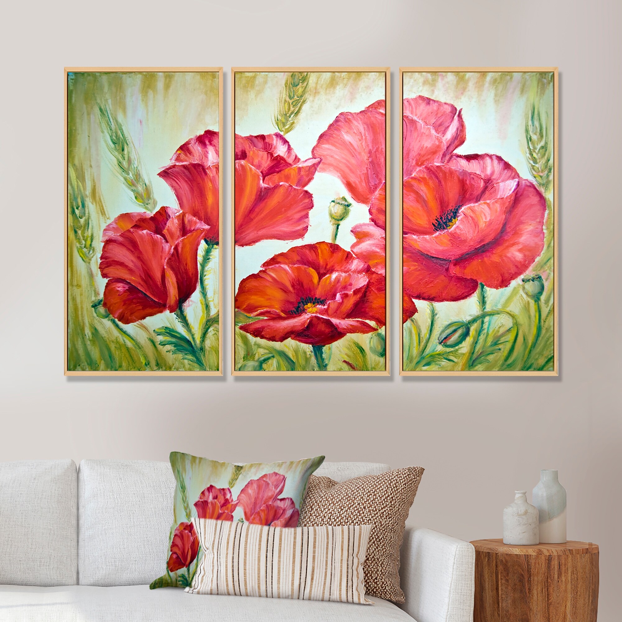 Designart "Poppies in Wheat" Floral Framed Canvas Wall Art Print Set of 3 - 4 Colors of Frames