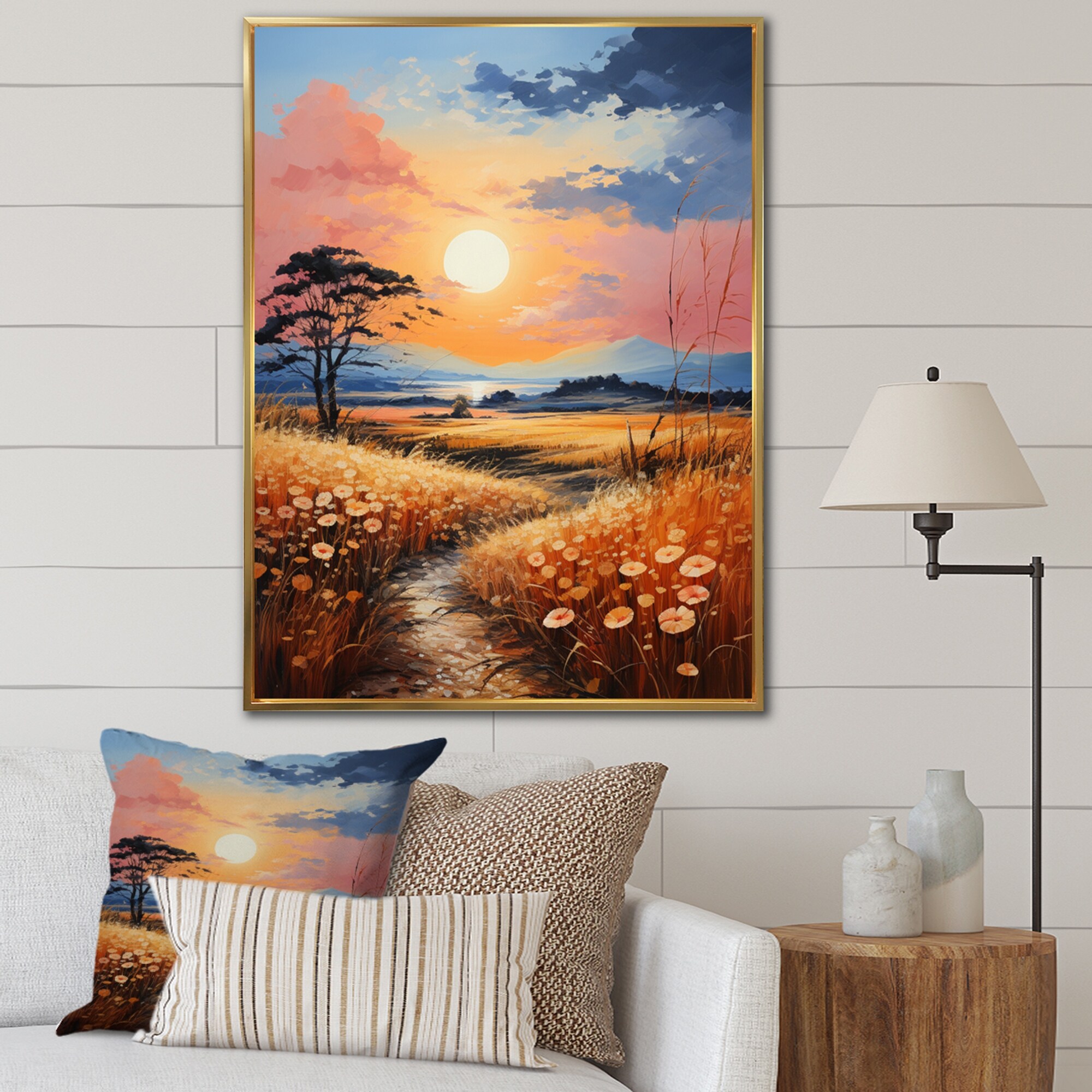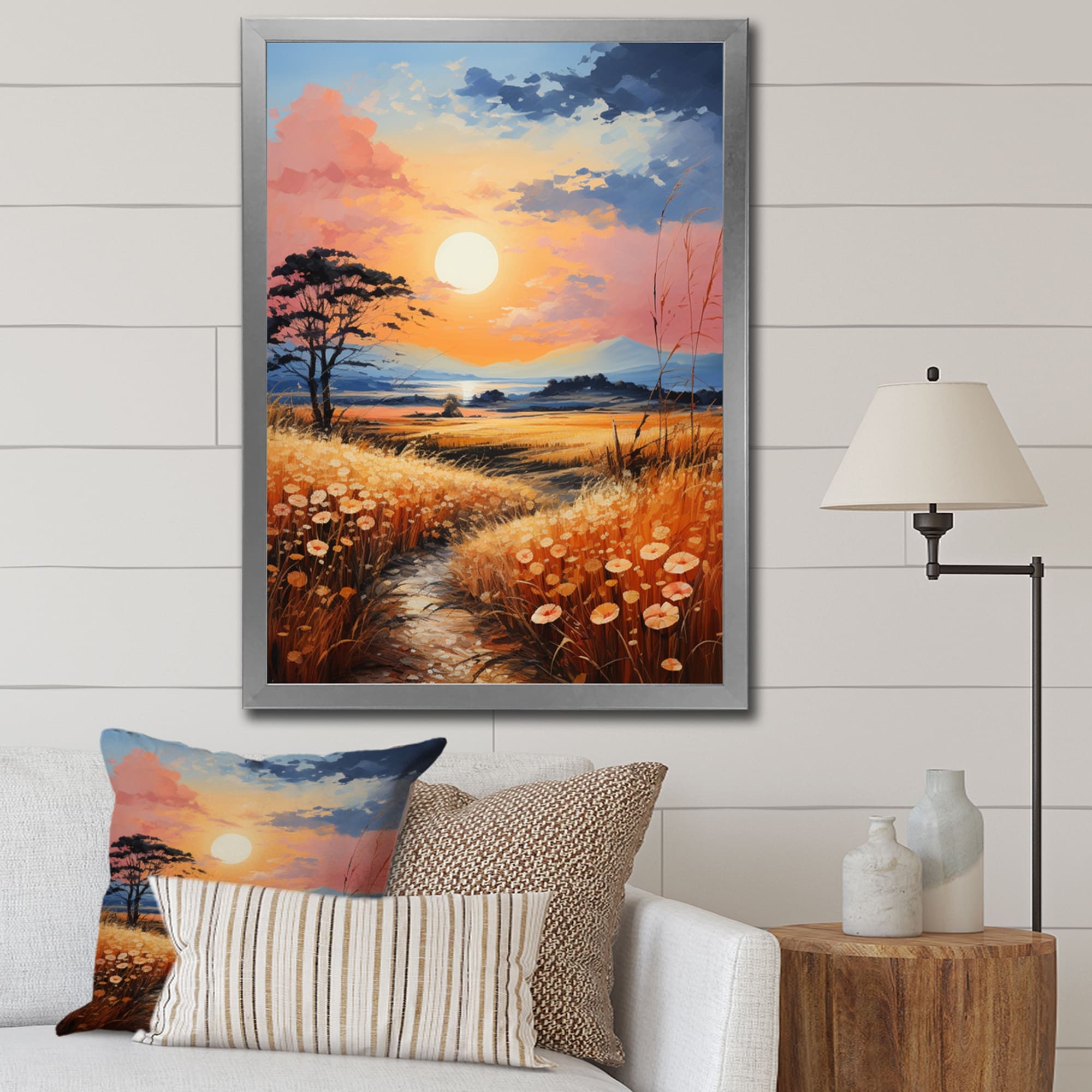 Designart "Bright Sunset over Wheat Field" Landscape Framed Canvas Art Print
