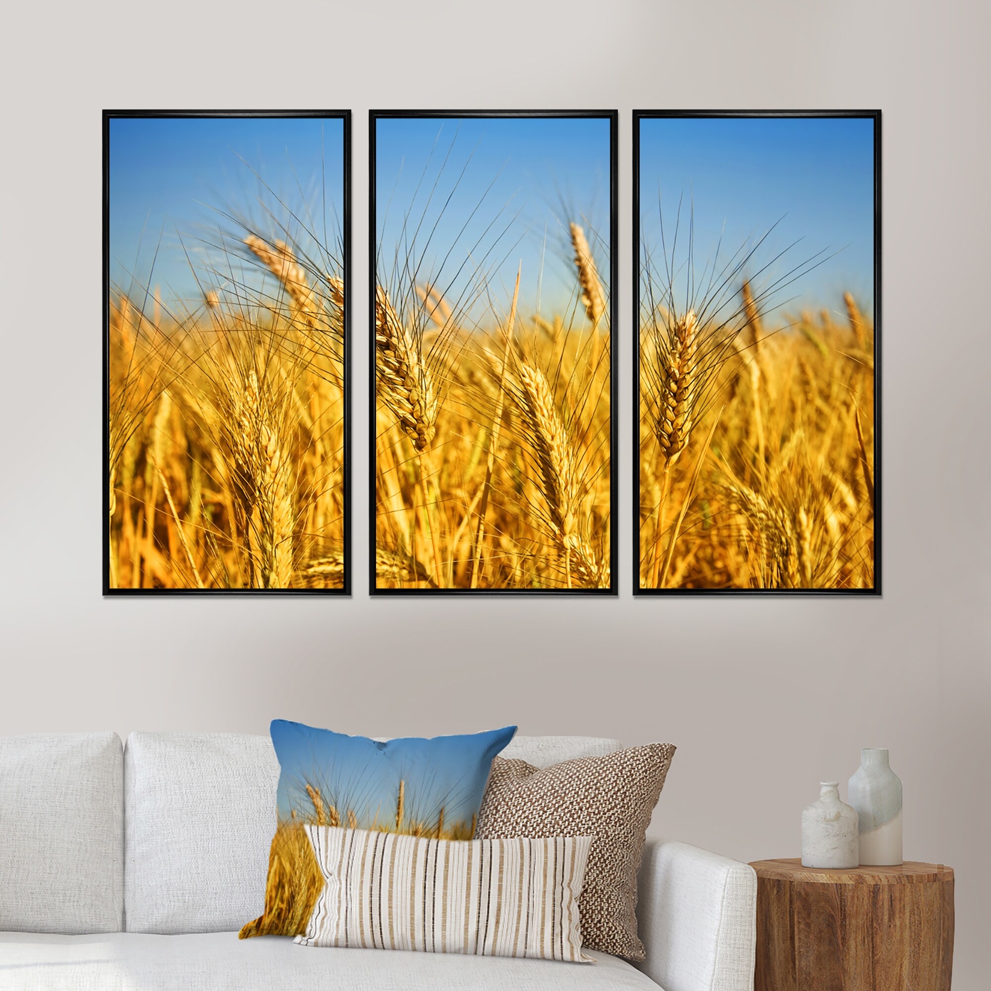 Designart "Bright Golden Wheat Field" Landscape Framed Canvas Wall Art Print Set of 3 - 4 Colors of Frames