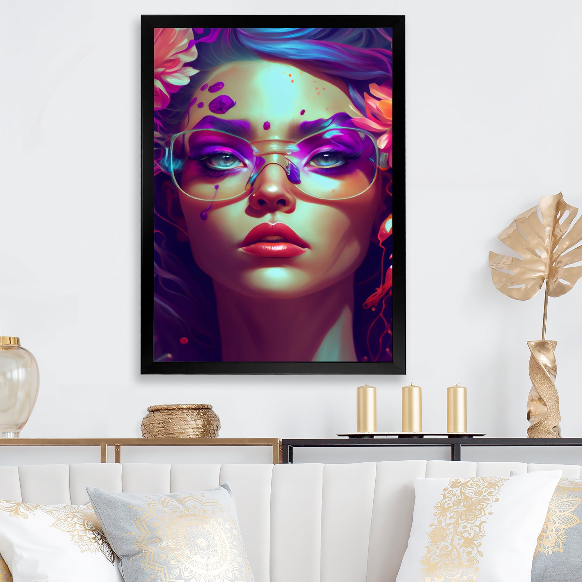 Designart "Abstract Rainbow Portrait I" Modern Woman Framed Wall Art Prints