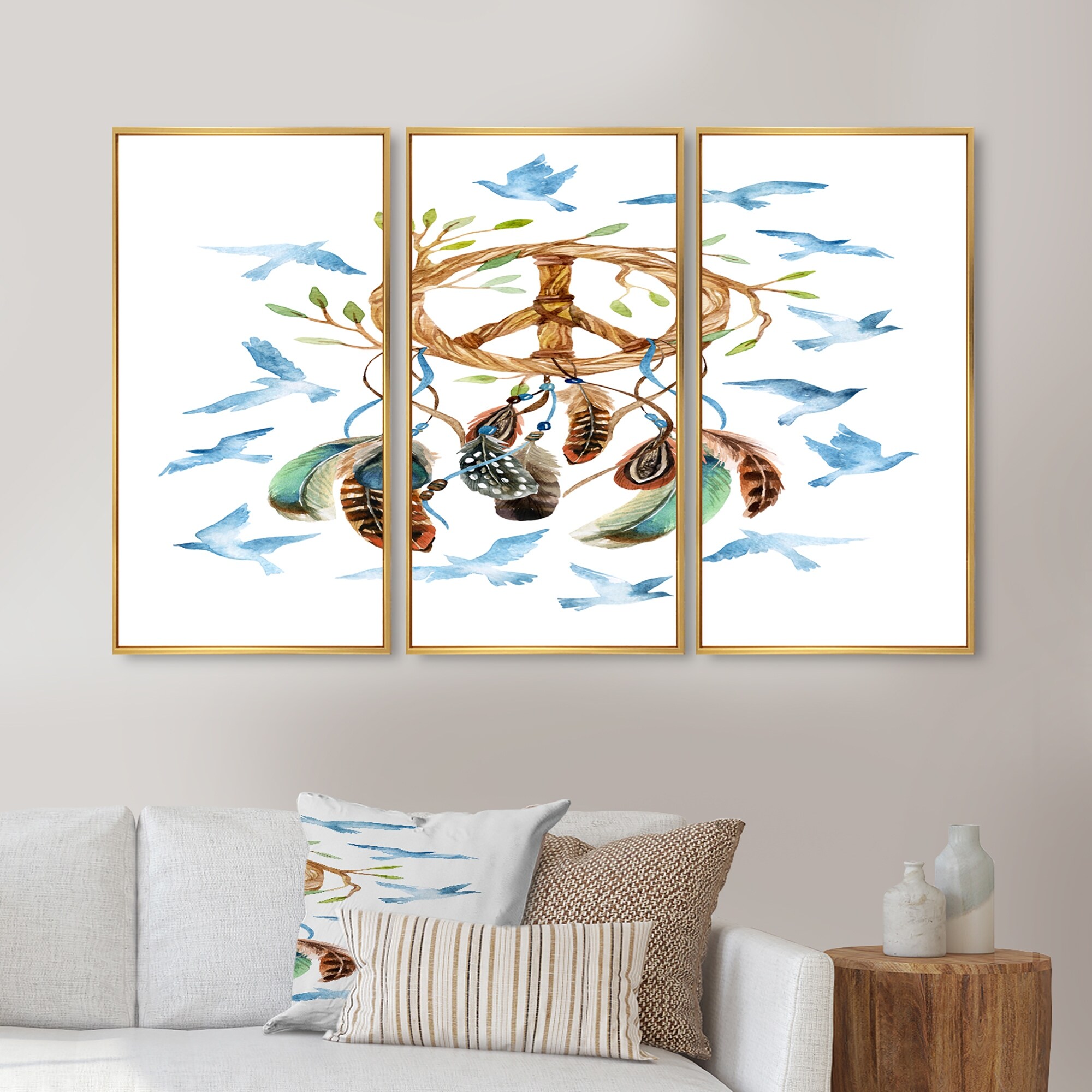Designart "Ethnic Dream Catcher And Peace Sign" Vintage Framed Canvas Wall Art Set of 3 - 4 Colors of Frames