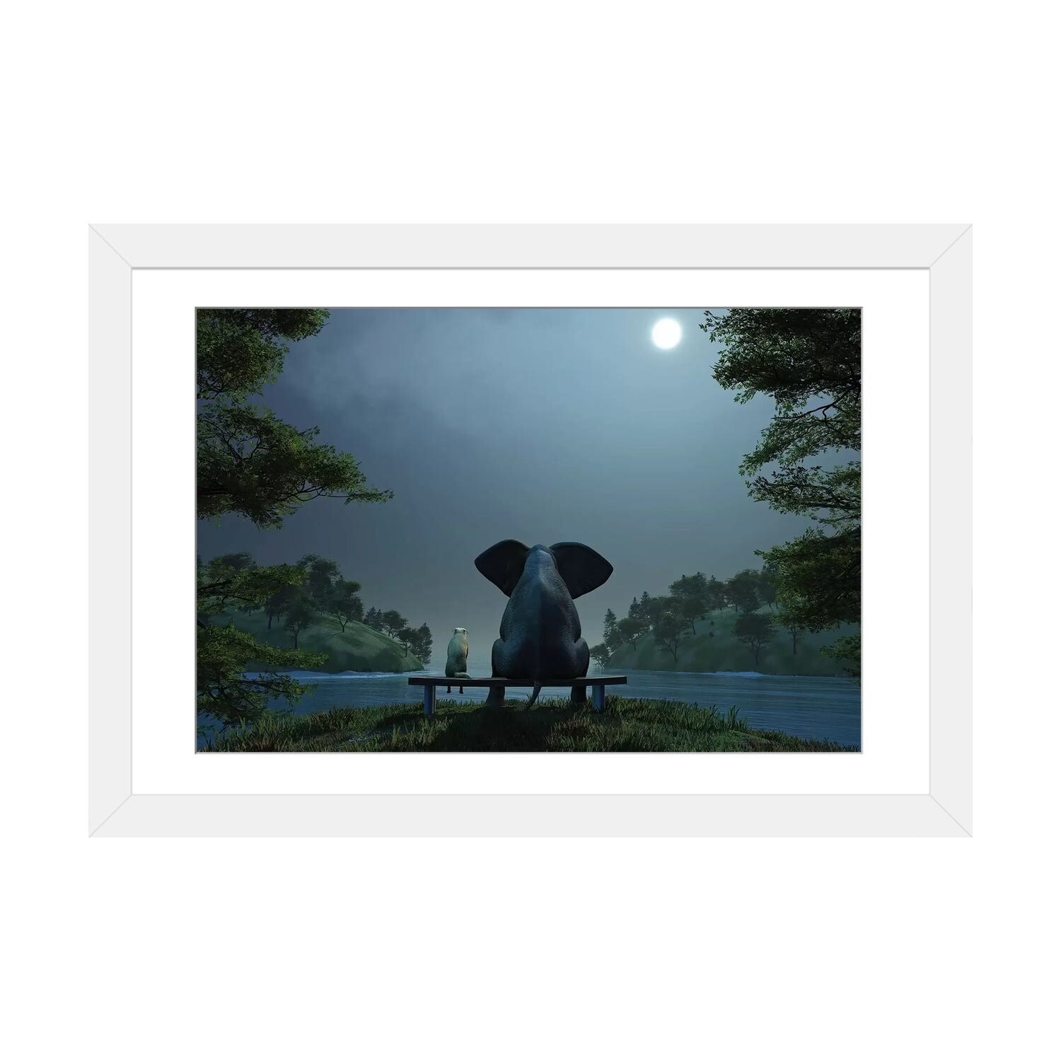 iCanvas "Elephant And Dog Are Sitting on A Meadow on A Moonlit Night" by Mike Kiev Framed