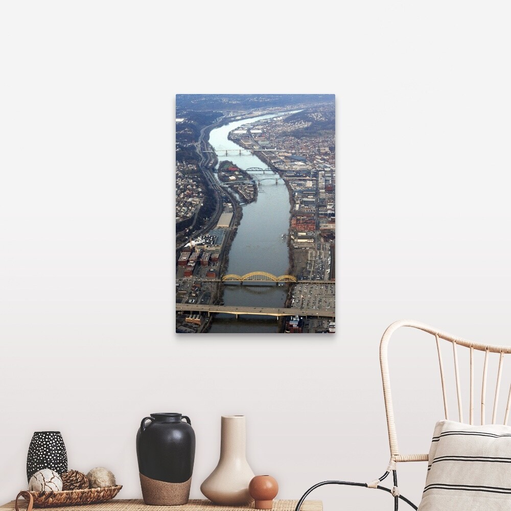 "Aerial shot of bridges over a river in Pittsburgh, Pennsylvania" Canvas Wall Art