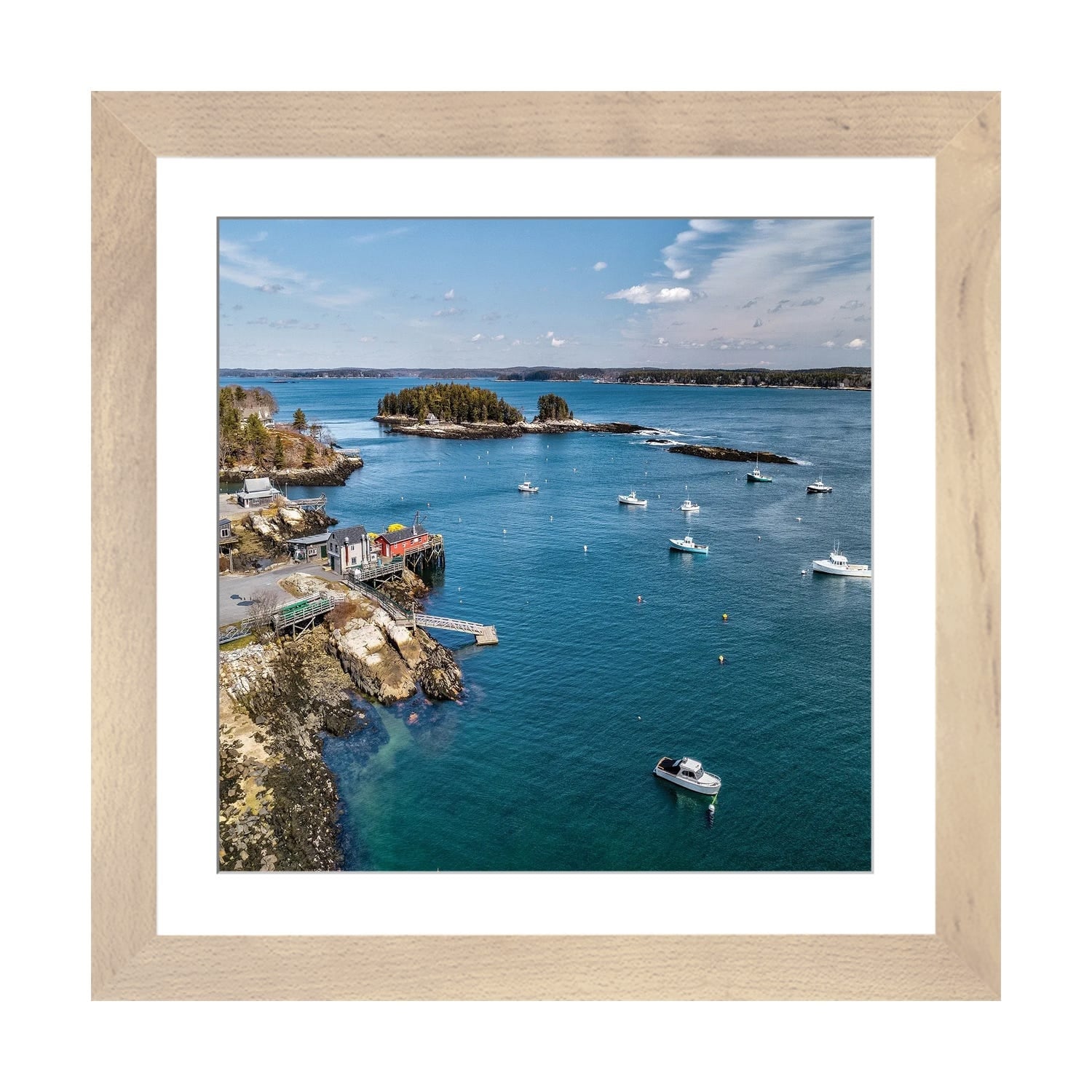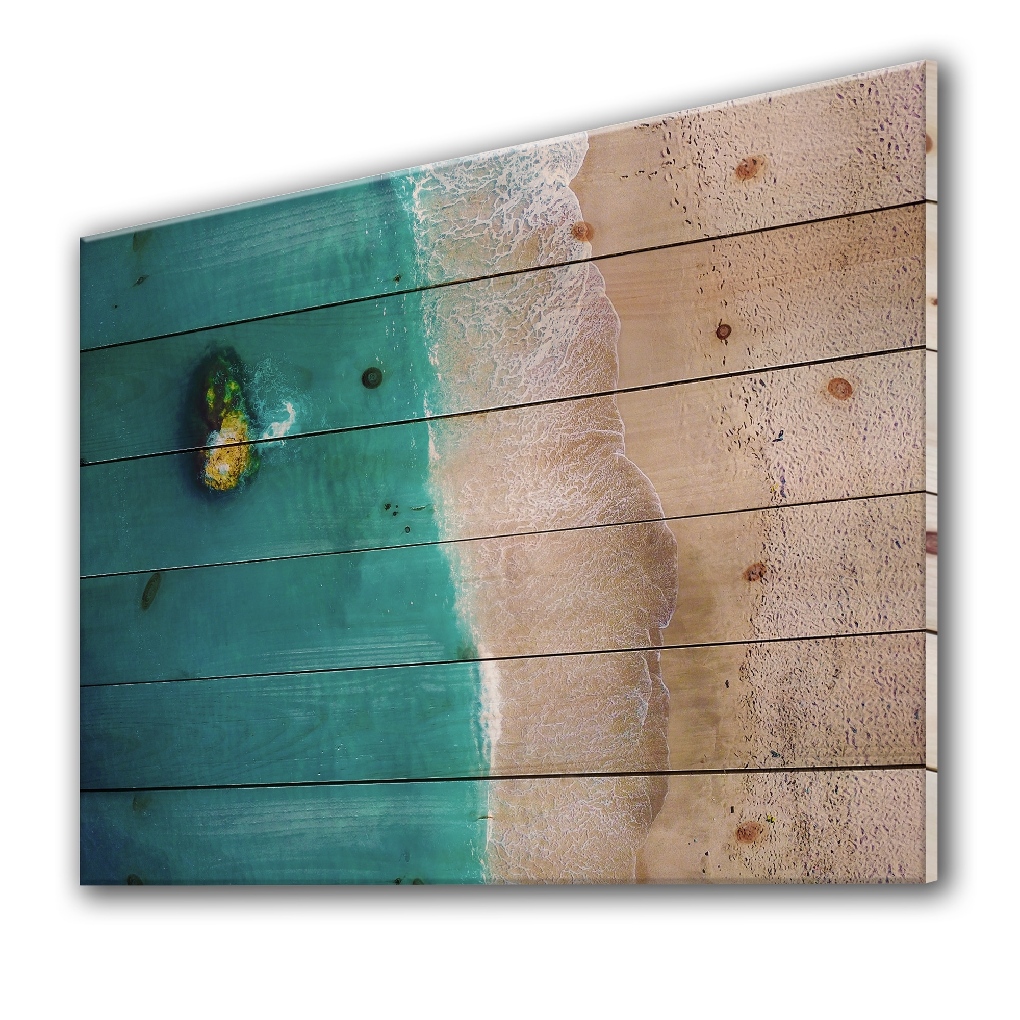 Designart 'Aerial View of Idyllic Blue Ocean Beach' Traditional Print on Natural Pine Wood