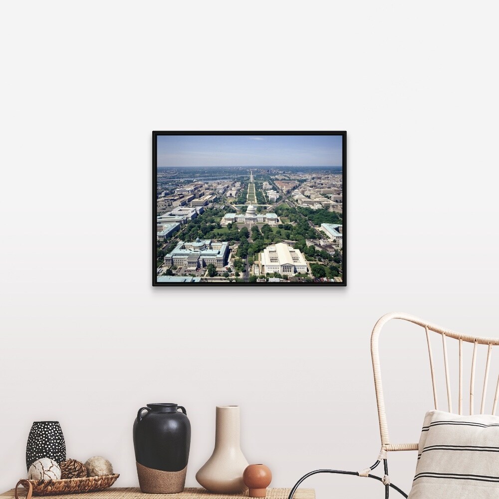 "Aerial view of buildings in a city, Washington DC" Black Float Frame Canvas Art