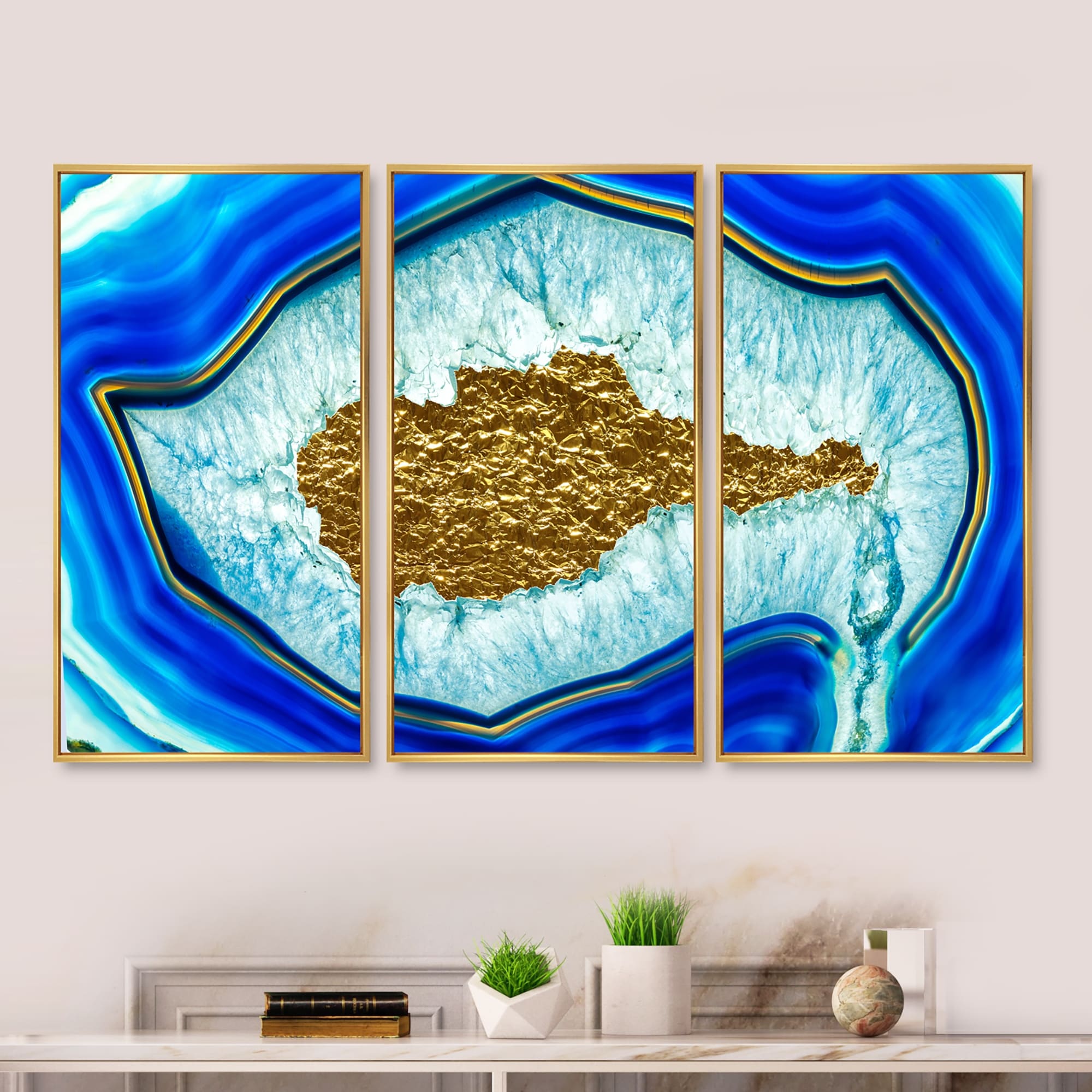 Designart "Golden Heart Blue Agate Stone" Glam Framed Artwork Set of 3 - 4 Colors of Frames