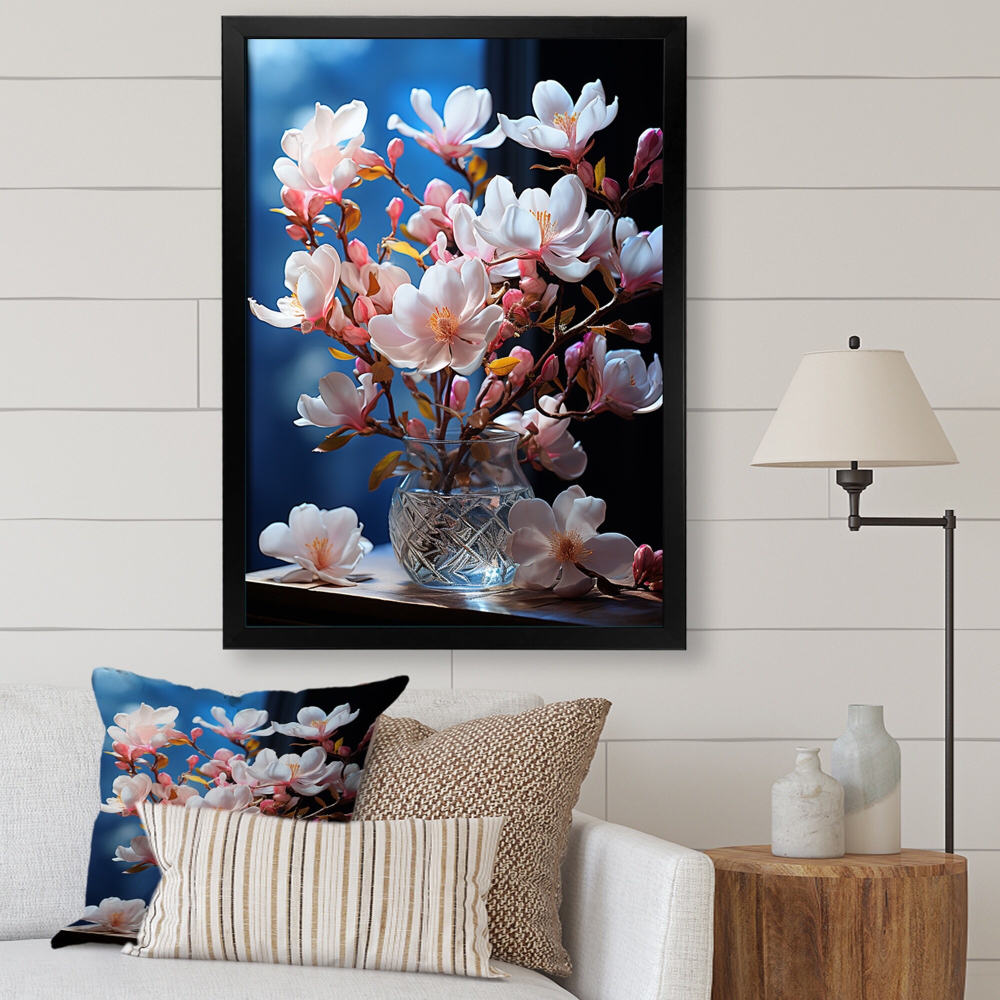Designart "Pink Blue Magnolias Magnolia Enchantment" Magnolias Framed Wall Art Living Room