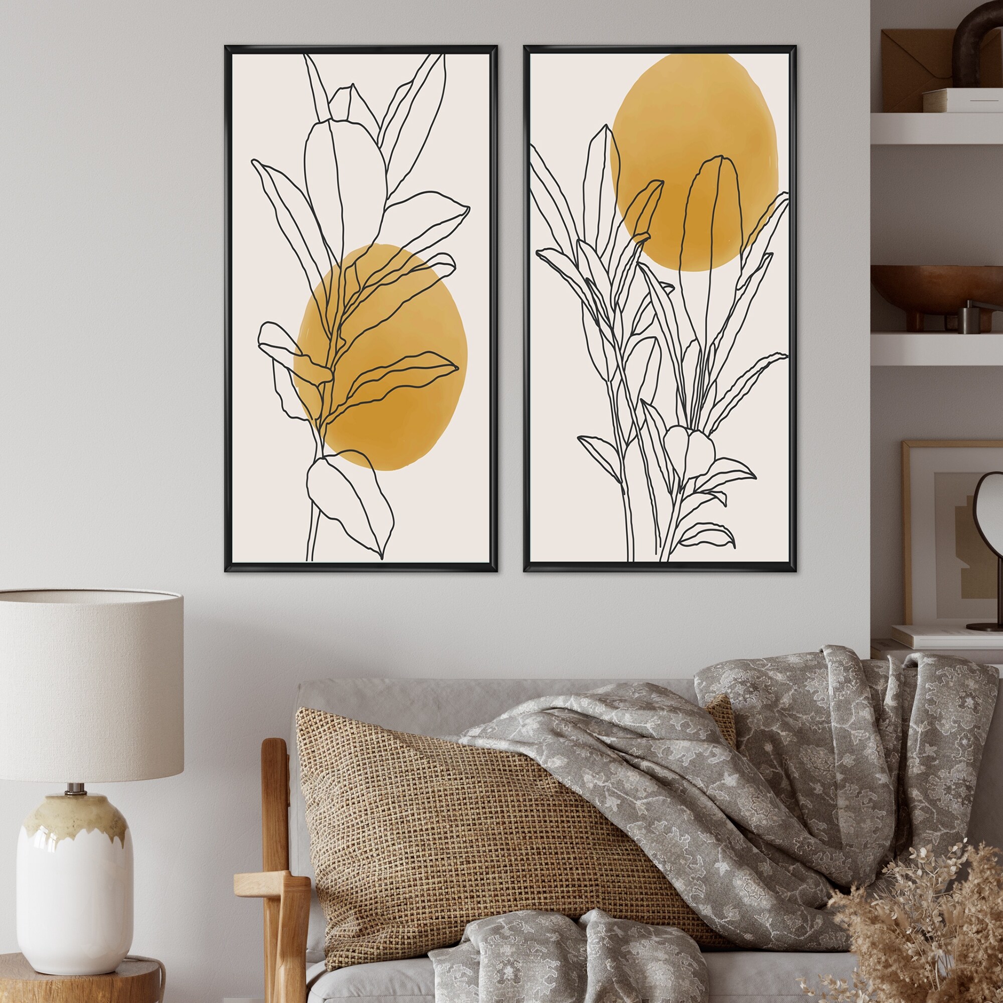 Designart "Yellow Botanical Branch With Leaves I" Floral Framed Art Set of 2 Pieces