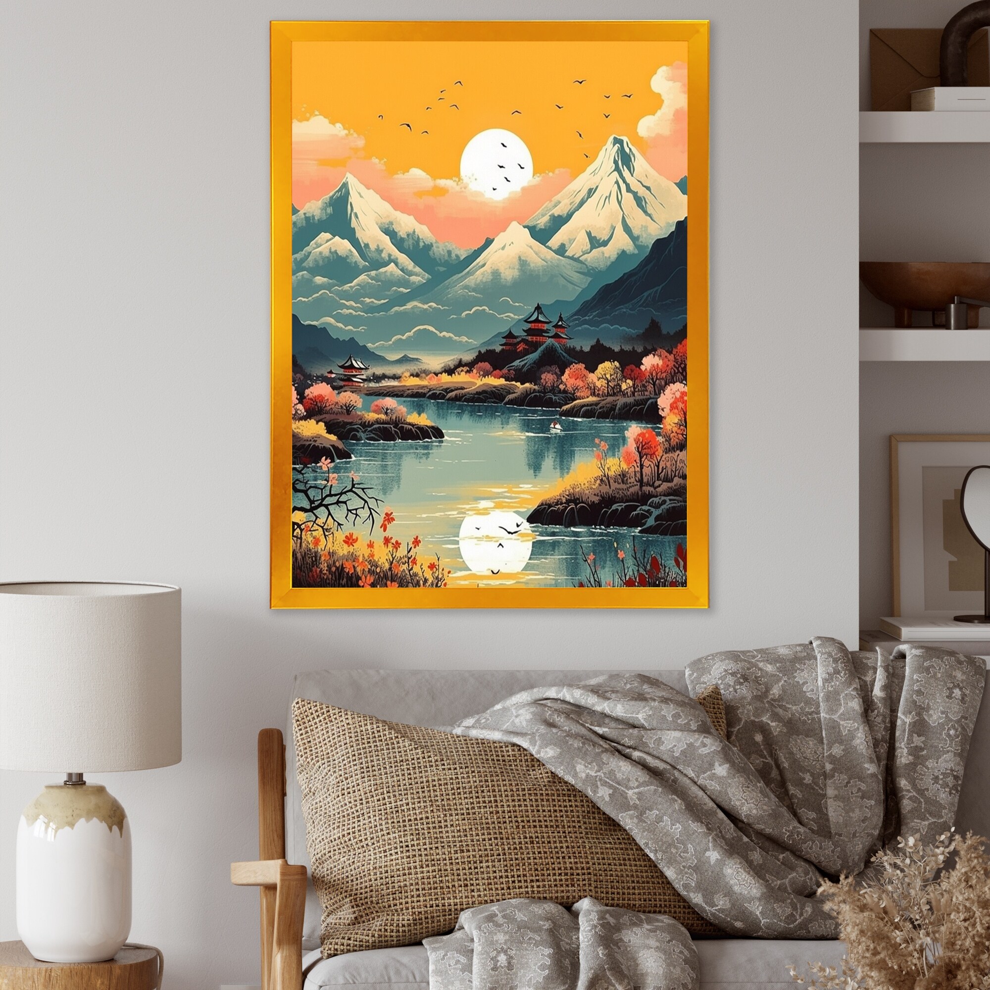 Designart "Yellow Graphic Moon in the Mountains II" Landscape Mountains Framed Art Print