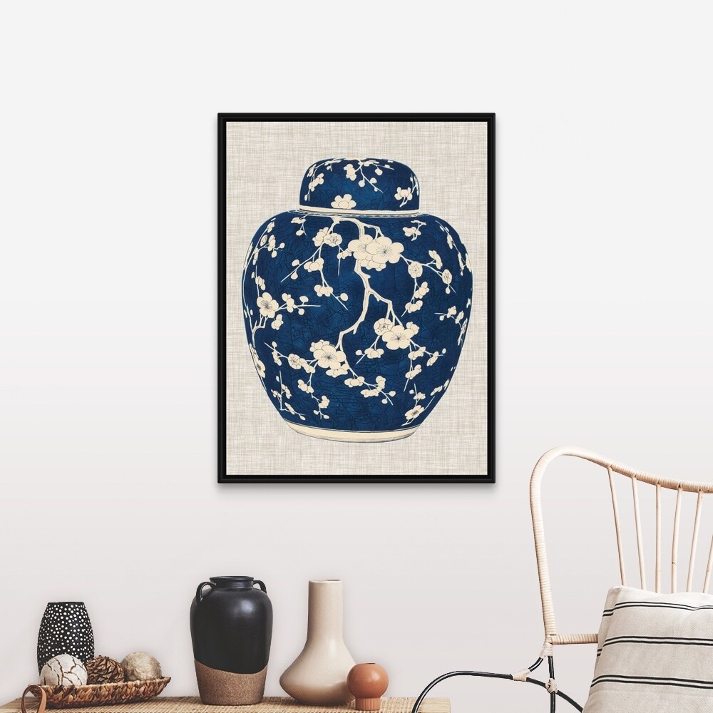 "Blue and White Ginger Jar on Linen II" Black Float Frame Canvas Art
