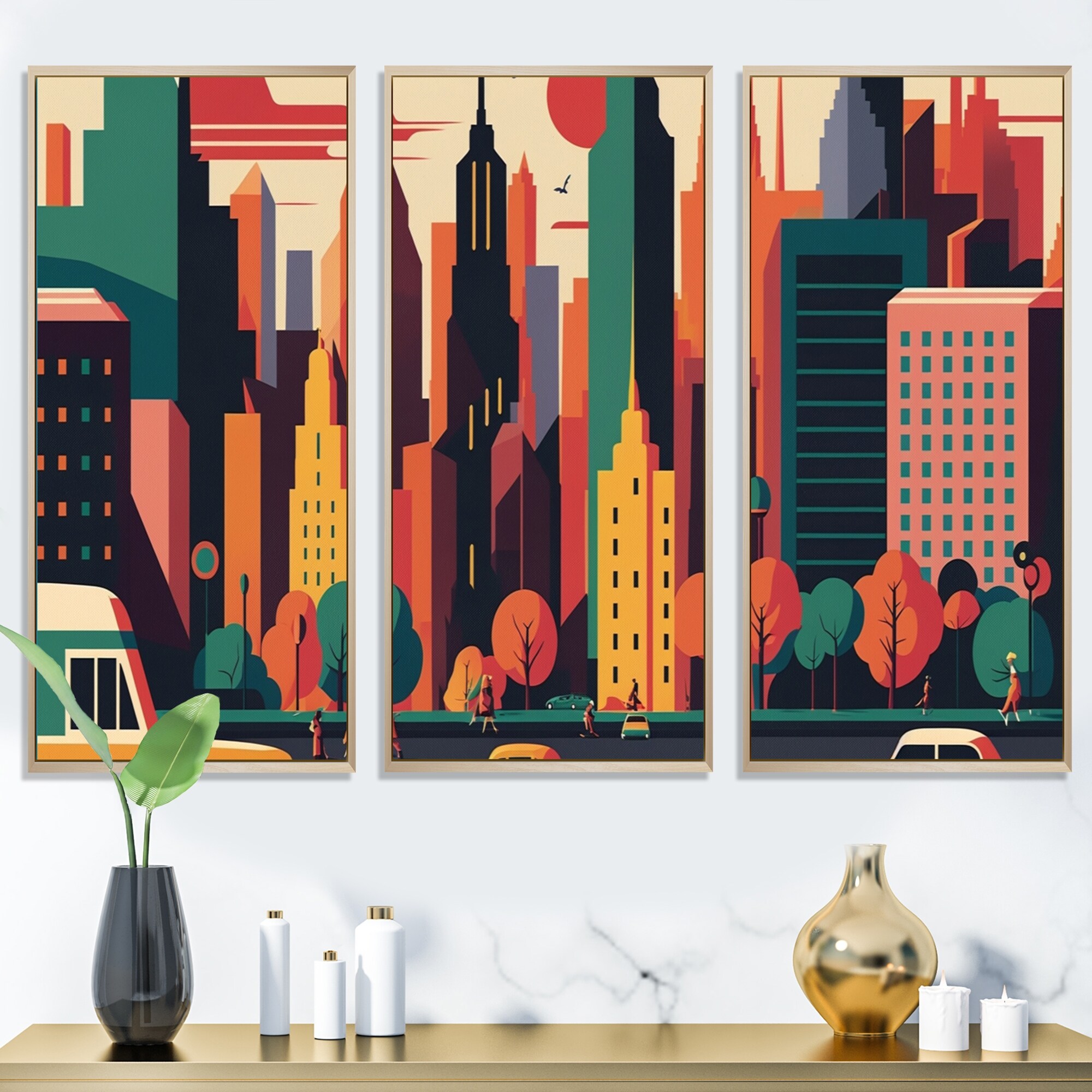 Designart "Colorful Cityscape I" City Art Deco Framed Canvas Art Print - 3 Panels