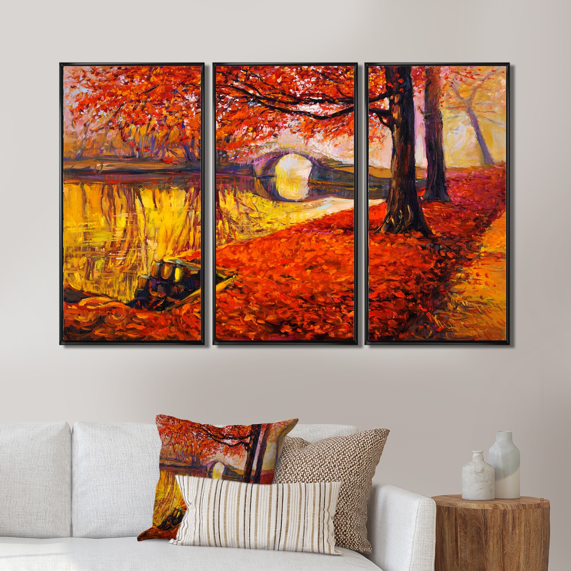Designart "Little Bridge in Orange Autumn Landscape I" Traditional Framed Wall Decor Set of 3 - 4 Colors of Frames