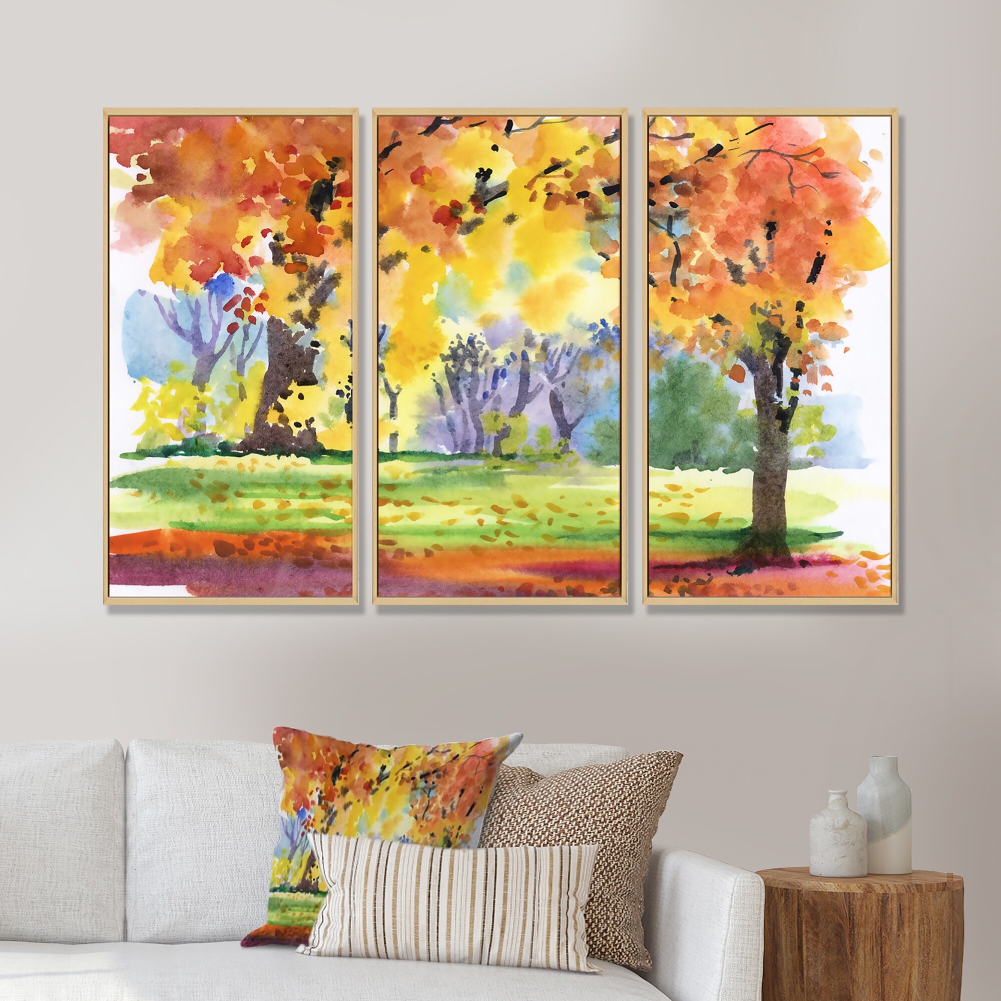 Designart "Autumn Park Yellow Trees Watercolor" Landscape Framed Canvas Wall Art Print Set of 3 - 4 Colors of Frames