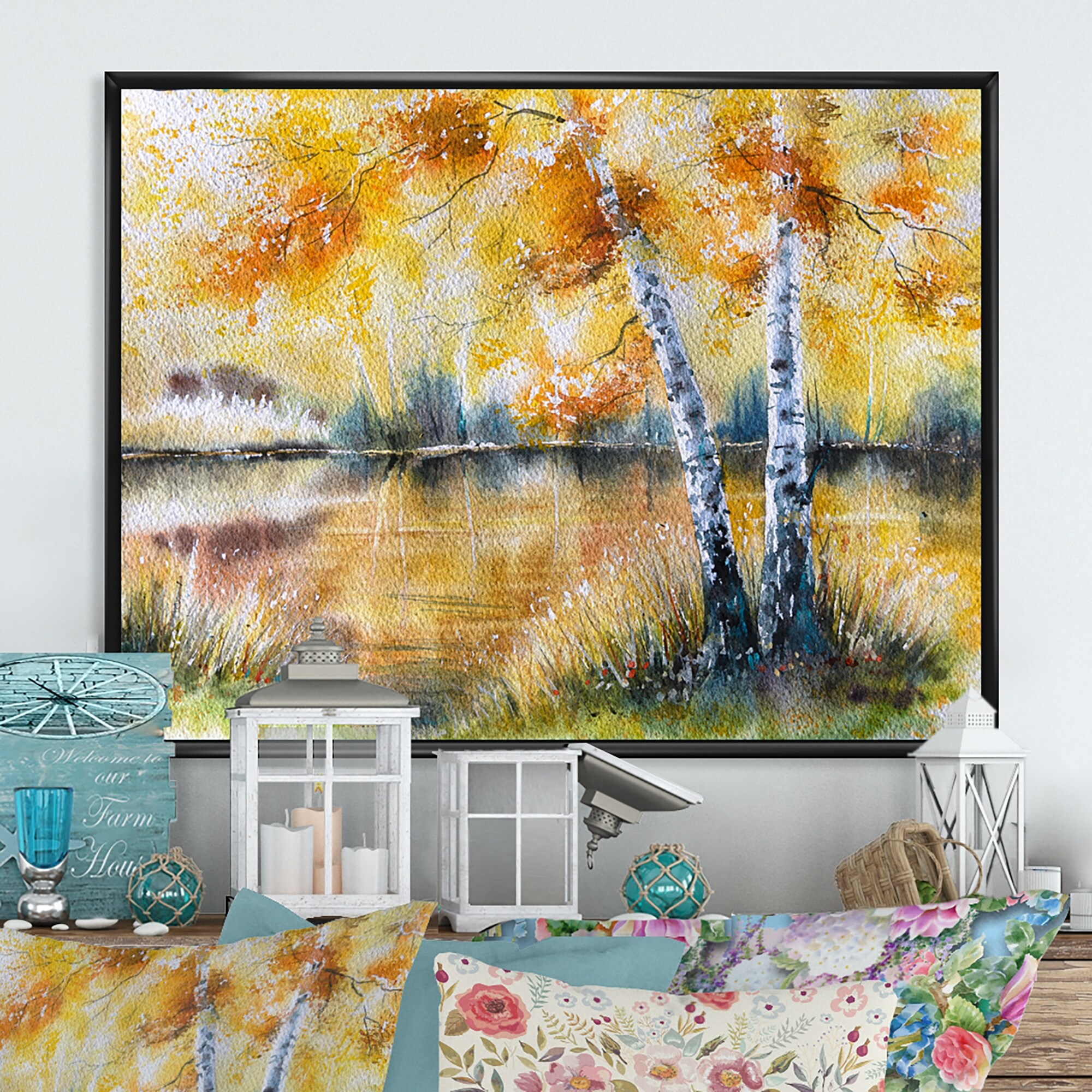 Designart "Autumn Landscape Birch Trees Lake" Traditional Framed Canvas artwork