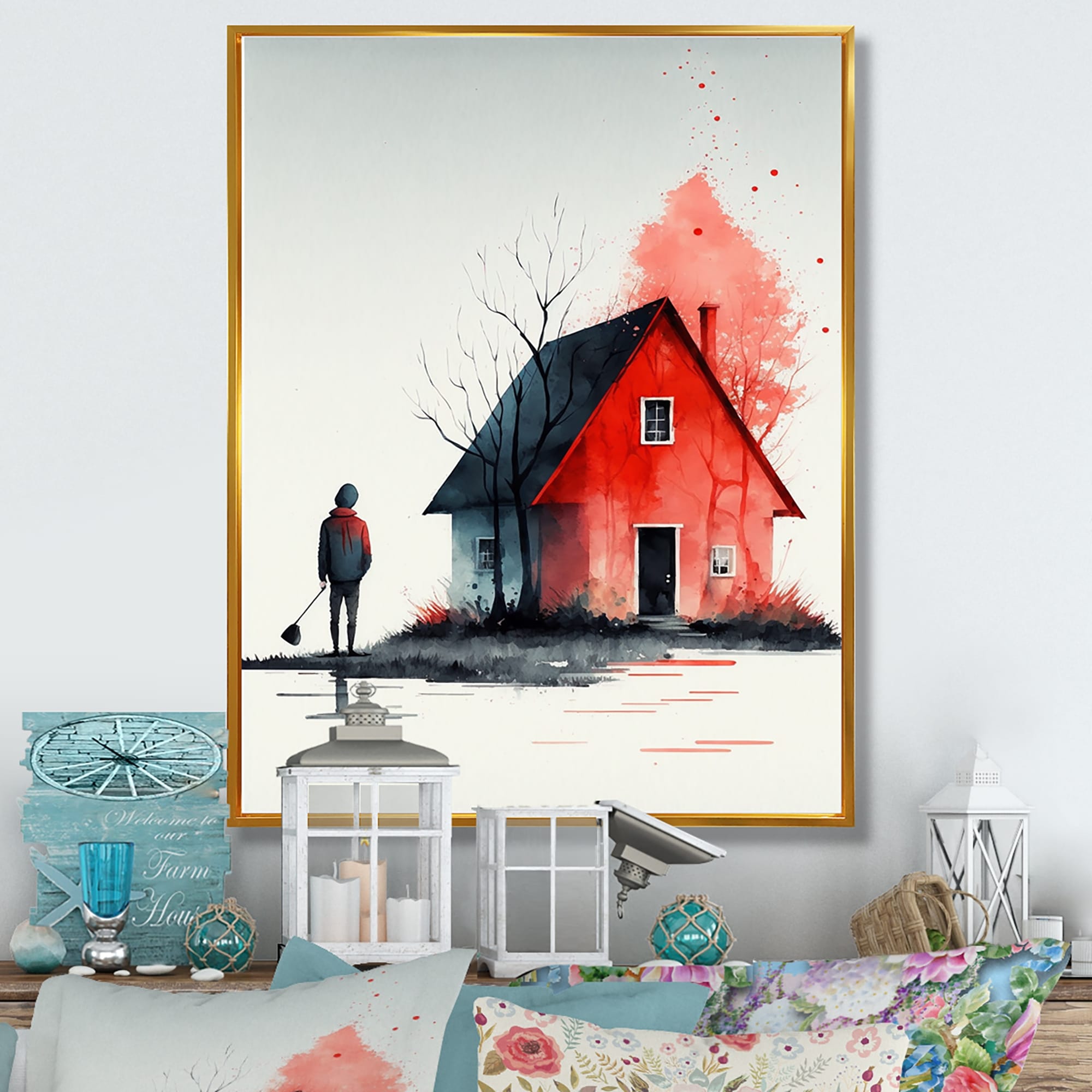 Designart "Autumn At the Countryhouse I" Lake House Cottage Framed Canvas Wall Art Print