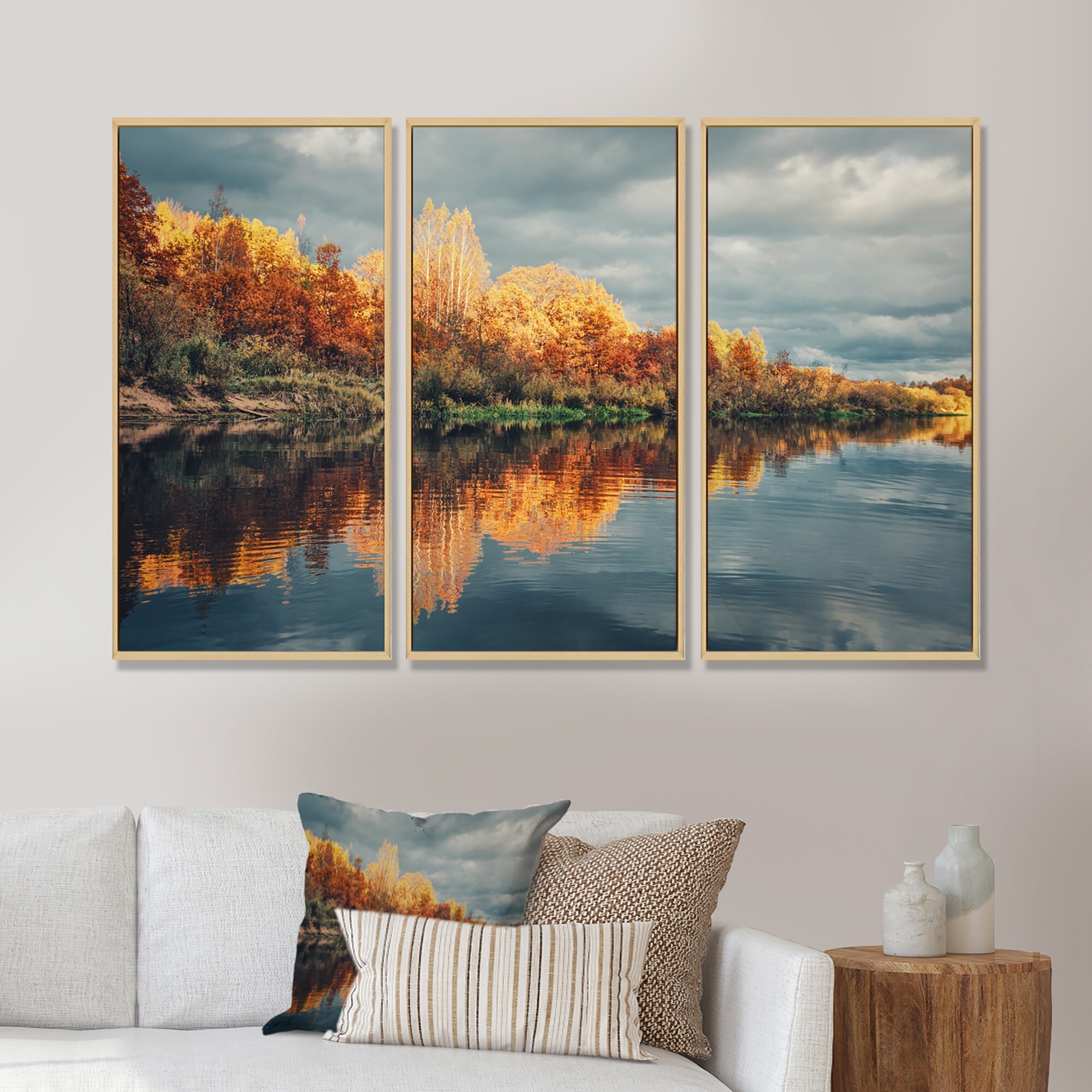 Designart "Picturesque Autumn Forest By the River" Traditional Framed Art Set of 3 - 4 Colors of Frames