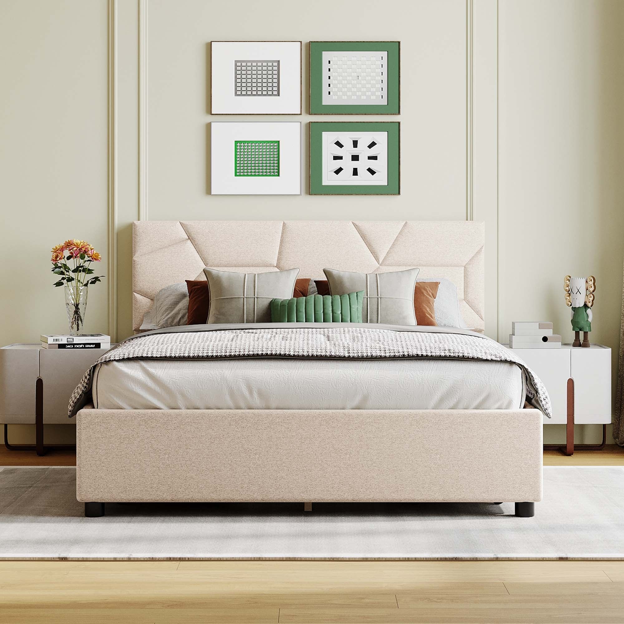 Full Size Linen Upholstered Platform Bed with Brick Pattern Upholstered Headboard and 4 Storage Drawers