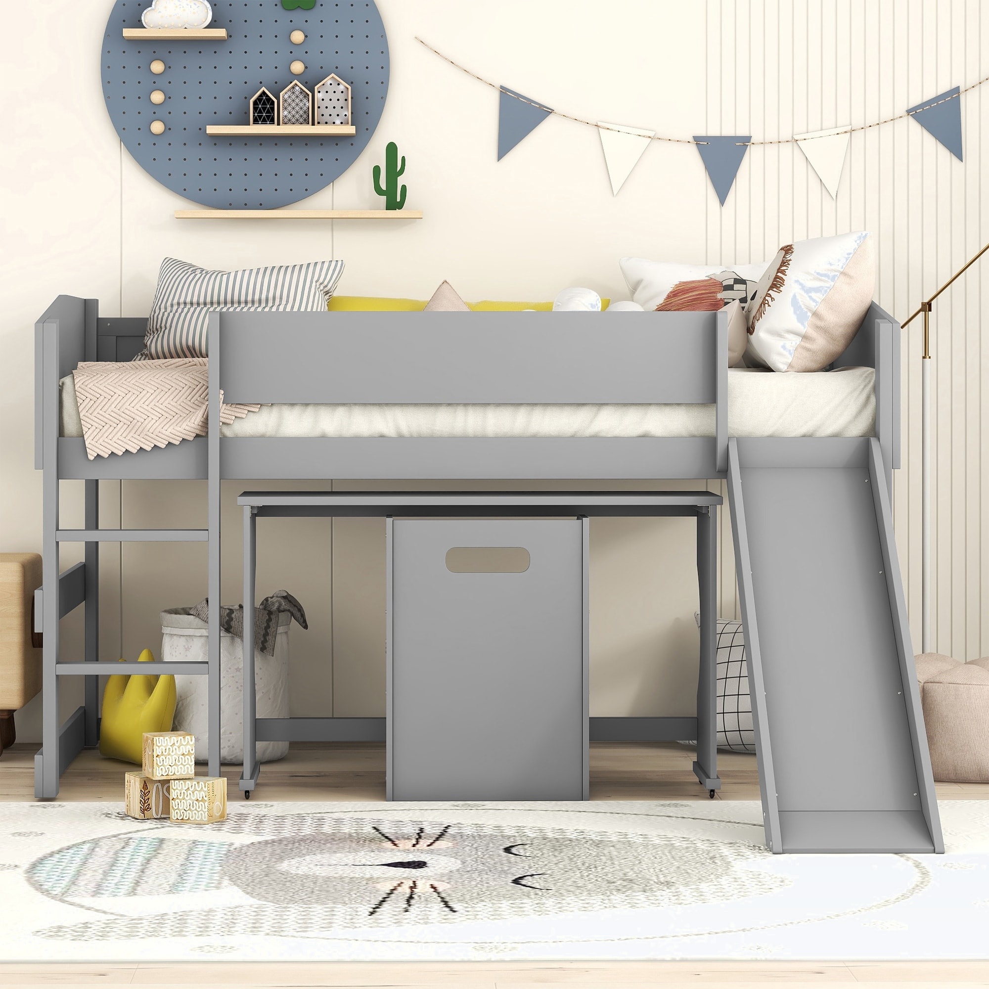 Twin size Low Loft Bed with Rolling Portable Desk and Chair,Slides