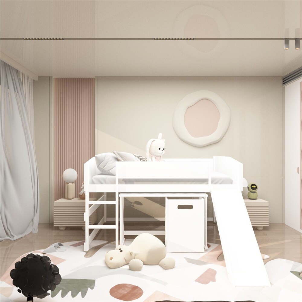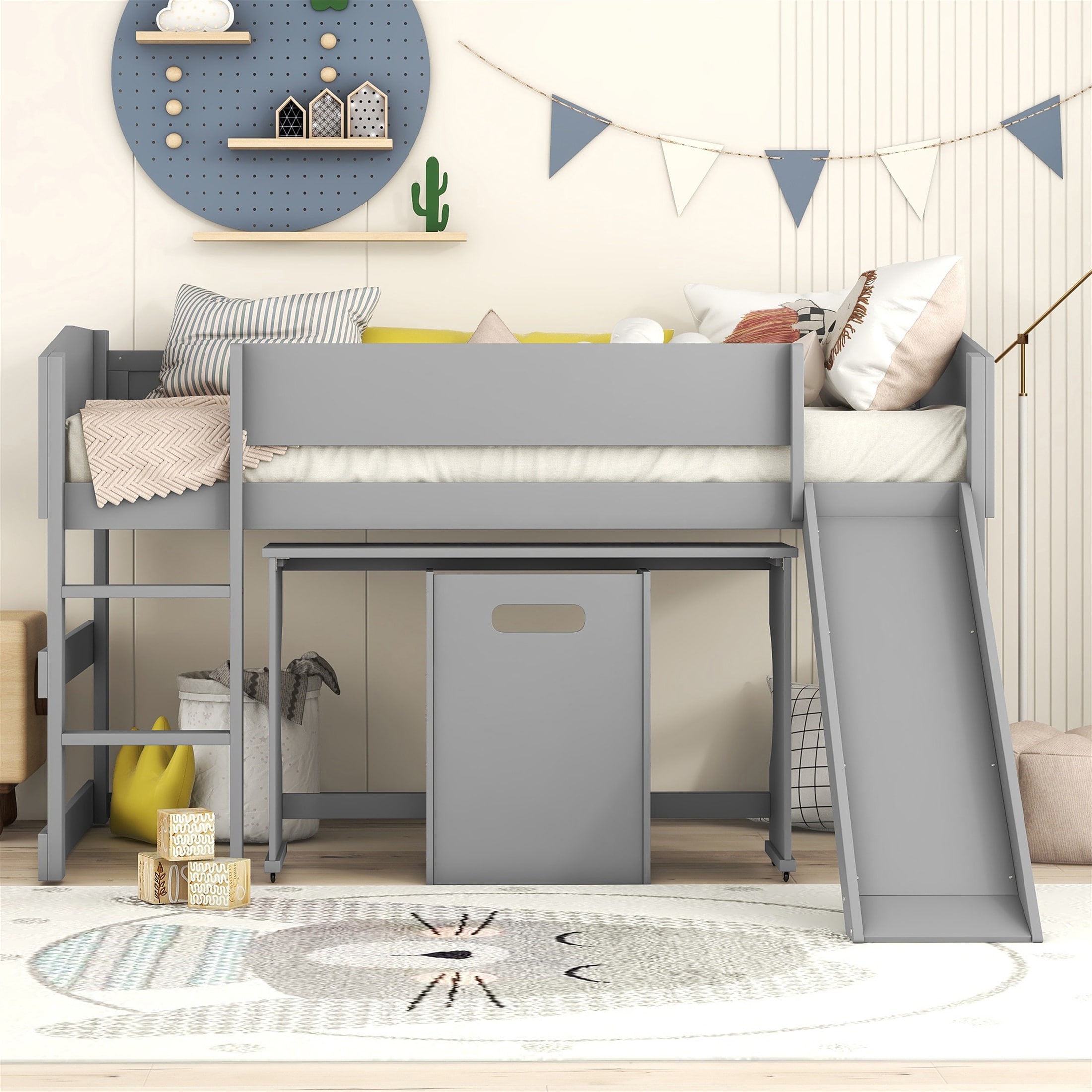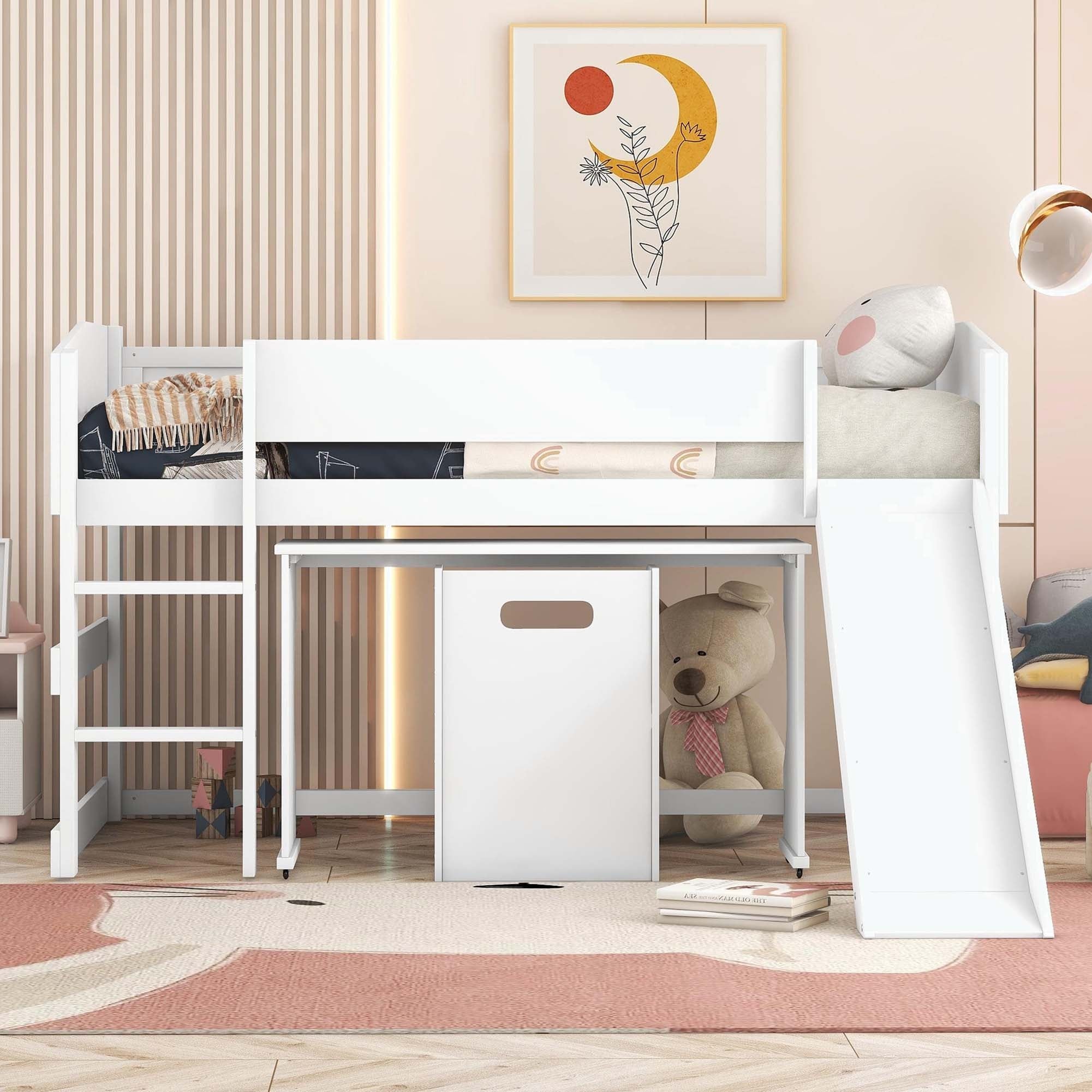 Low Study Loft Bed with Rolling Portable Desk and Chair, Slide