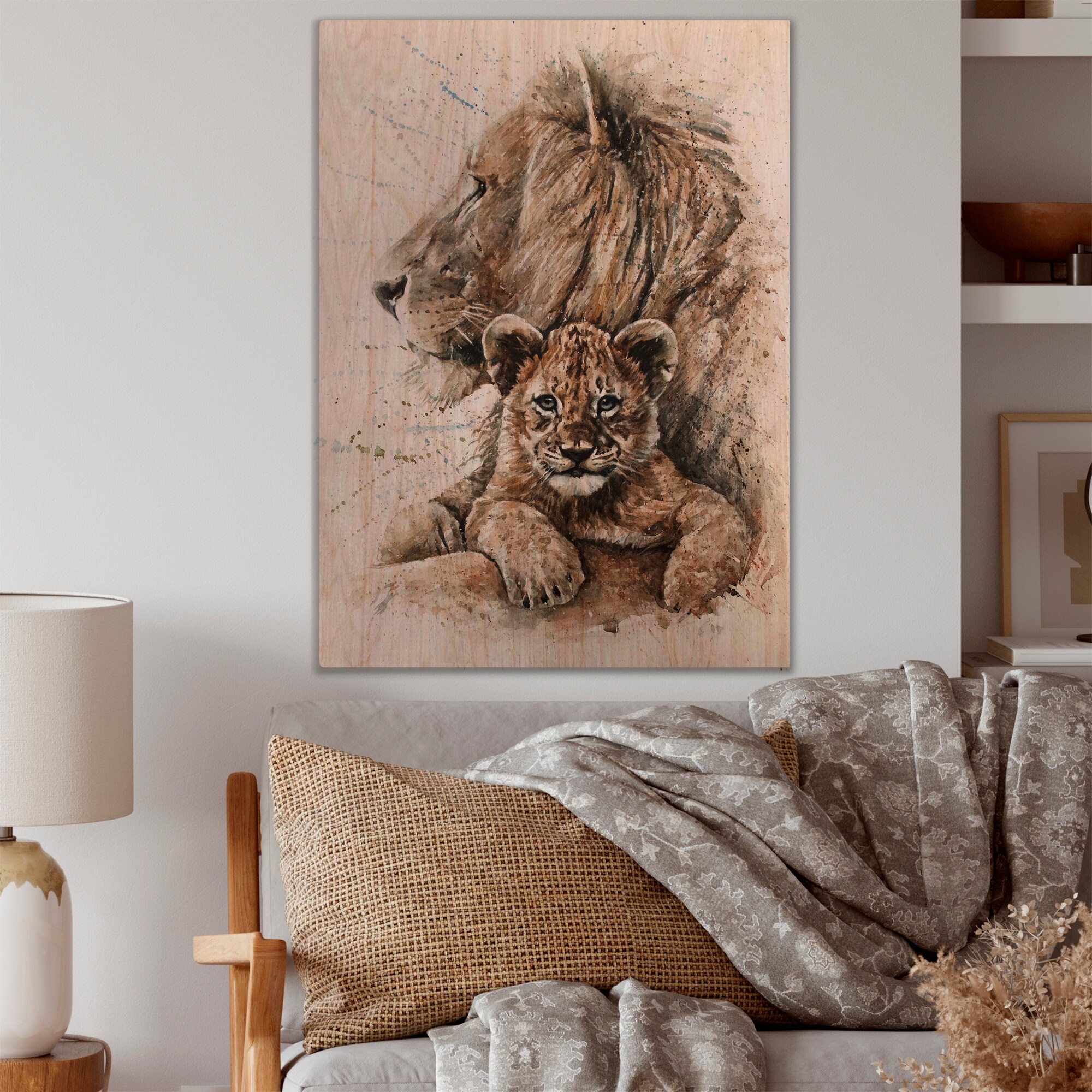 Designart 'Lion Dad Son Painting' Traditional Wood Wall Art Décor - Natural Pine Wood