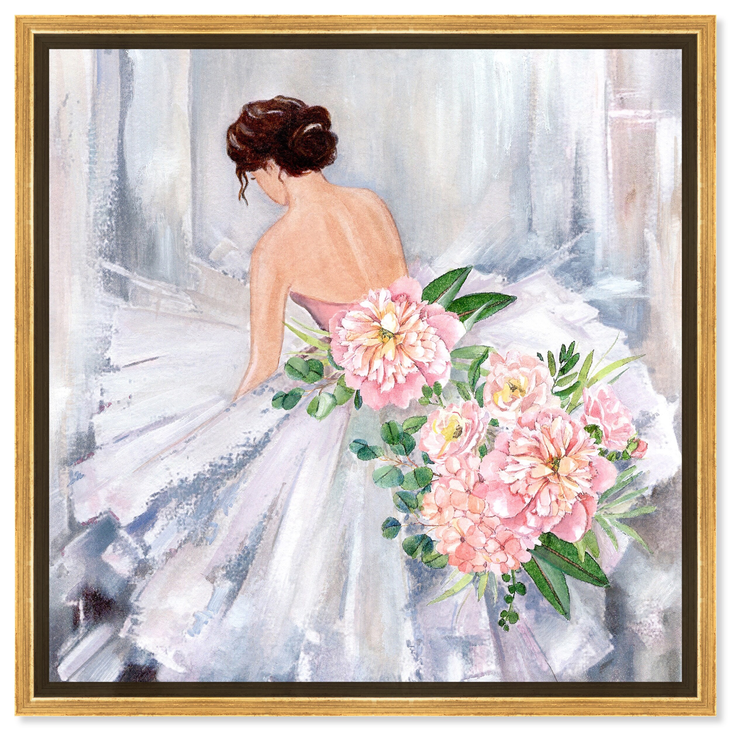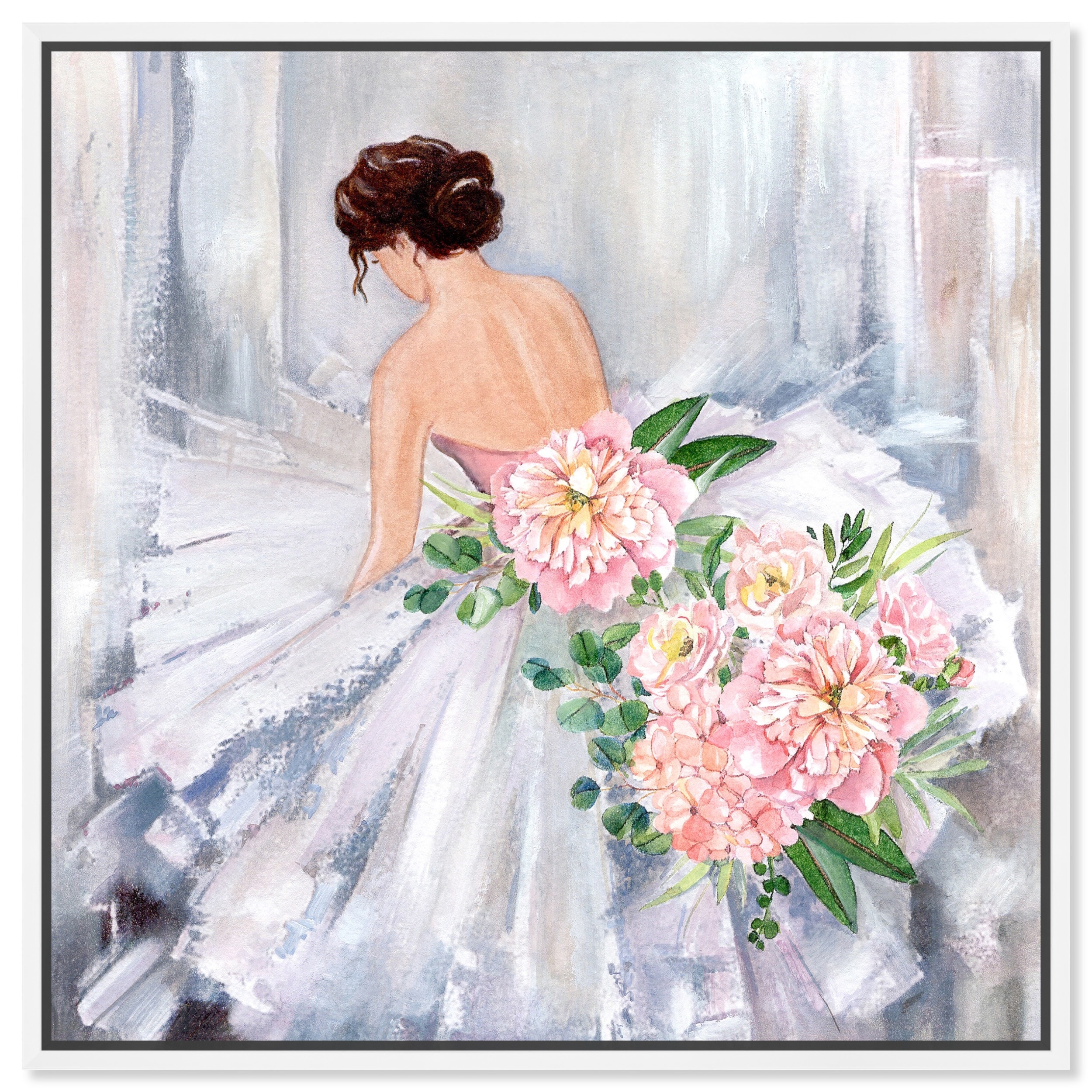"Perfect Grey", Ballerina Dancer Flowers Traditional White Framed Canvas Wall Art Print for Bedroom