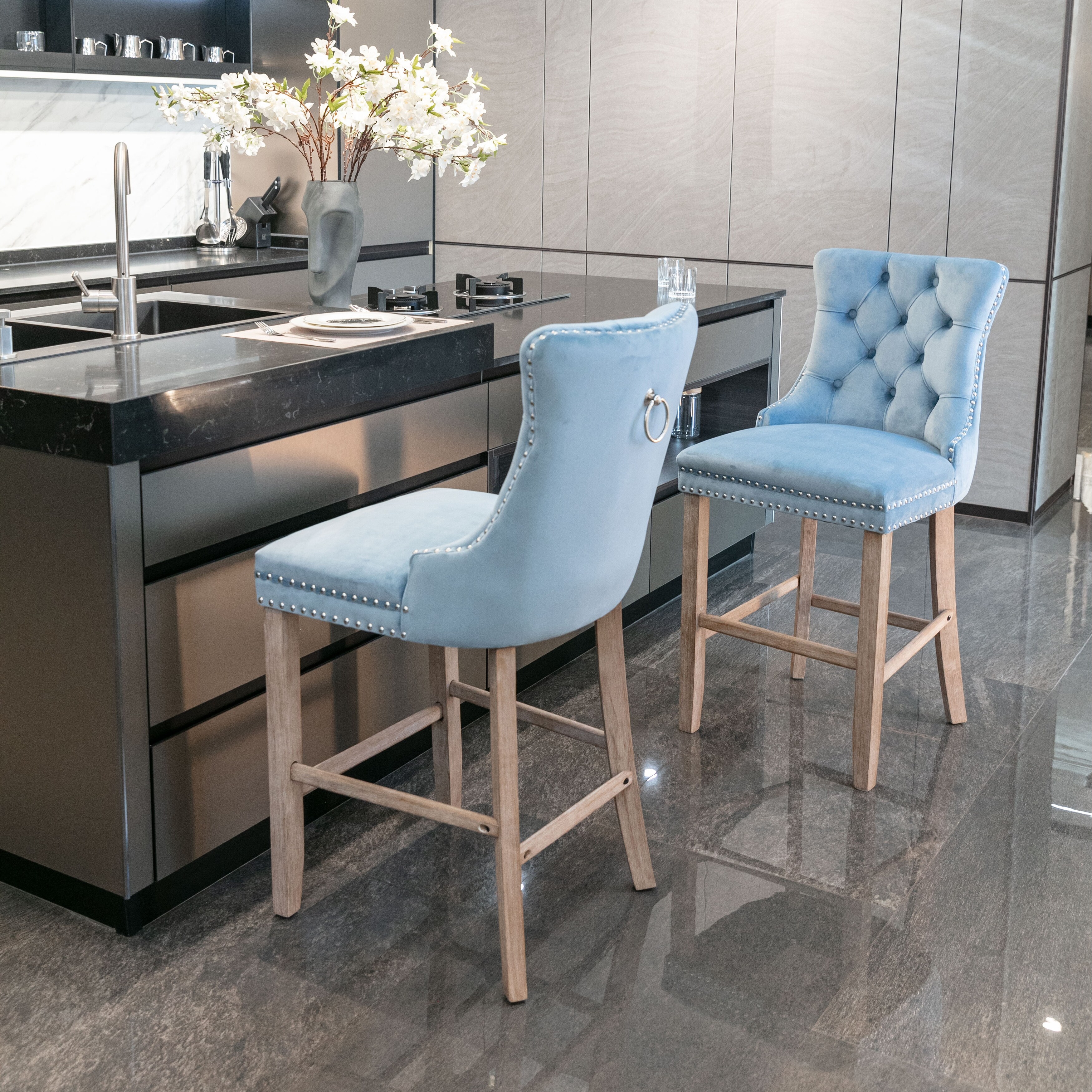 Barstools with Button Tufted Decoration and Wooden Legs,Set of 2