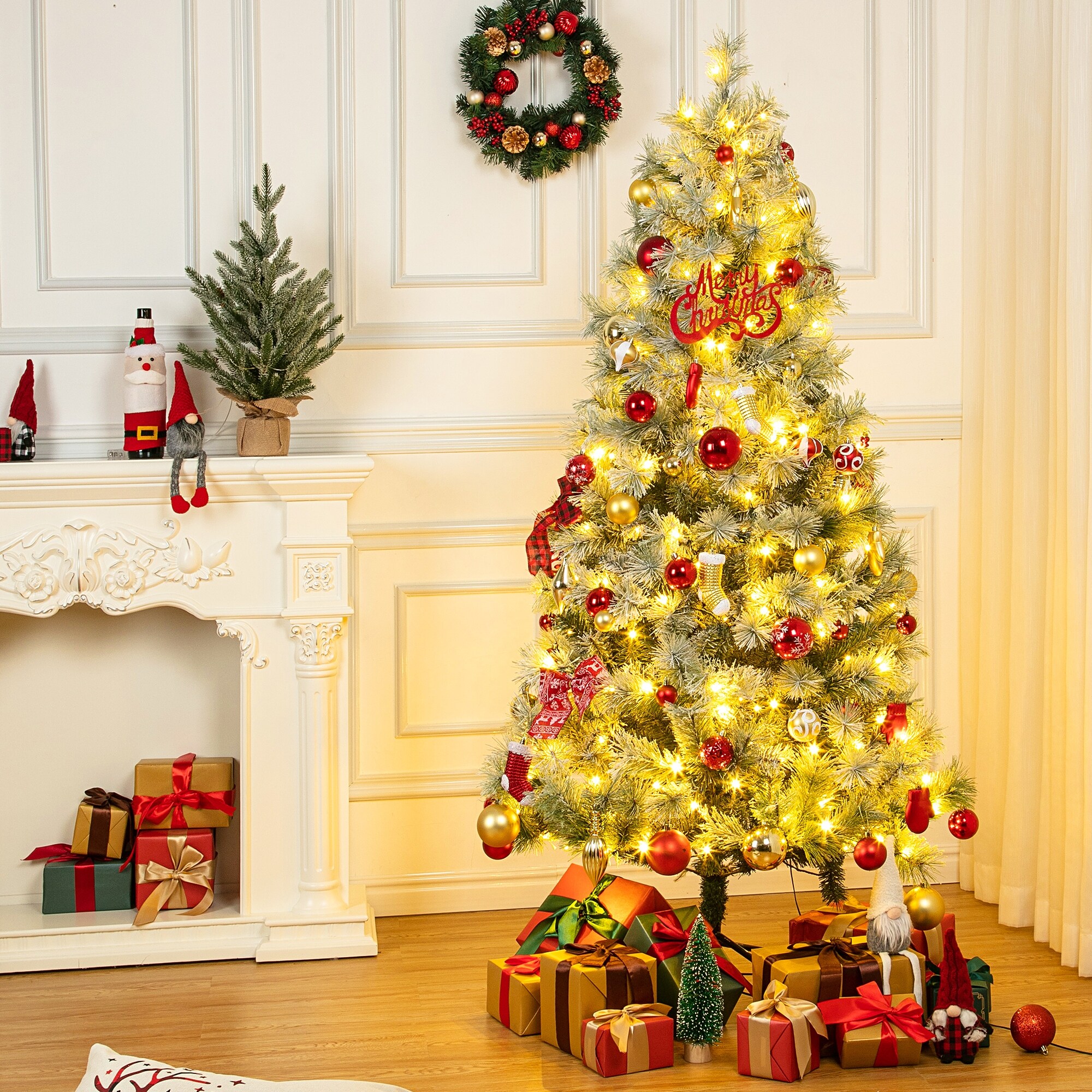 Costway 6/7 FT Pre-Lit Flocked Christmas Tree Hinged Xmas Decoration