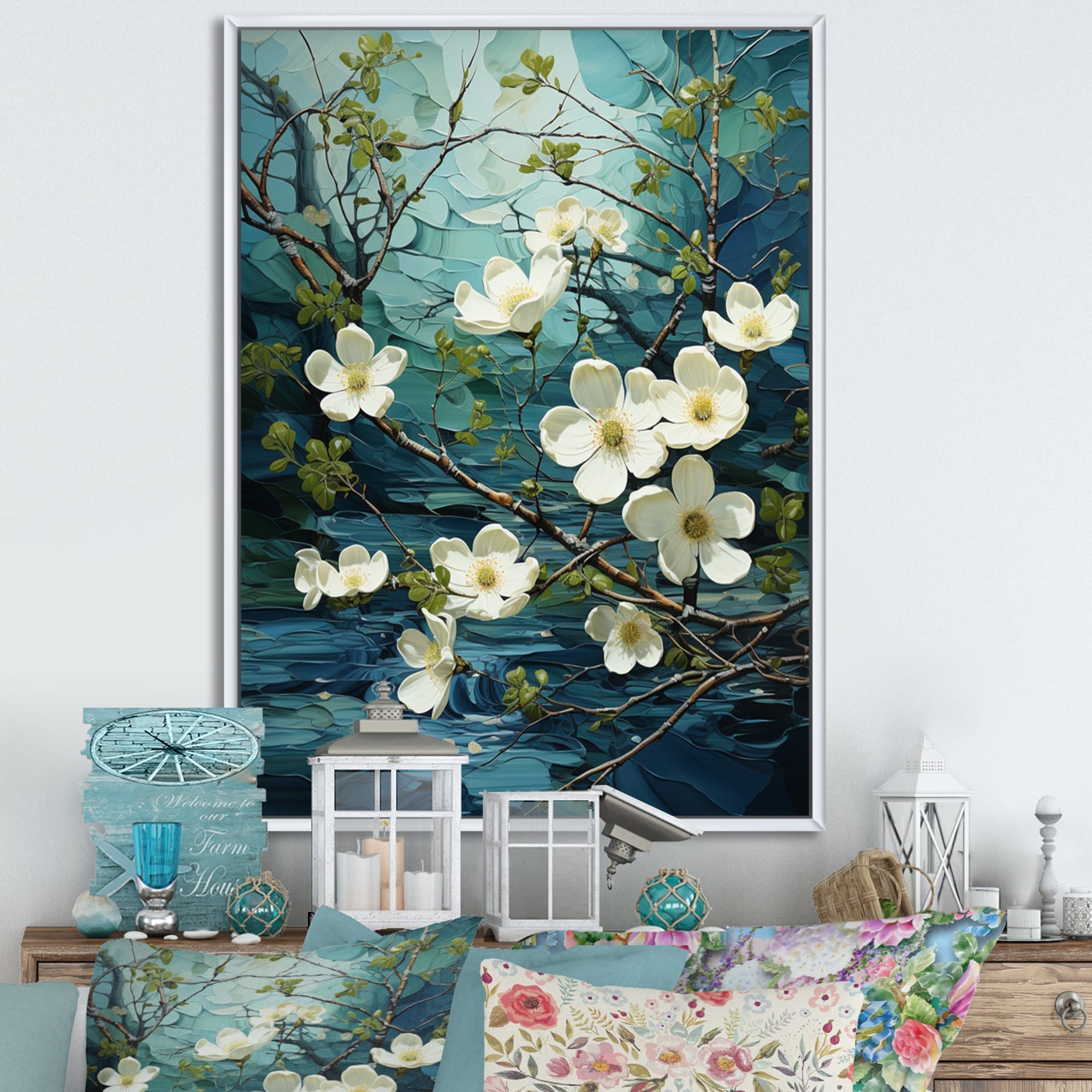 Designart "Teal White Dogwood Delight" Dogwood Framed Canvas Prints