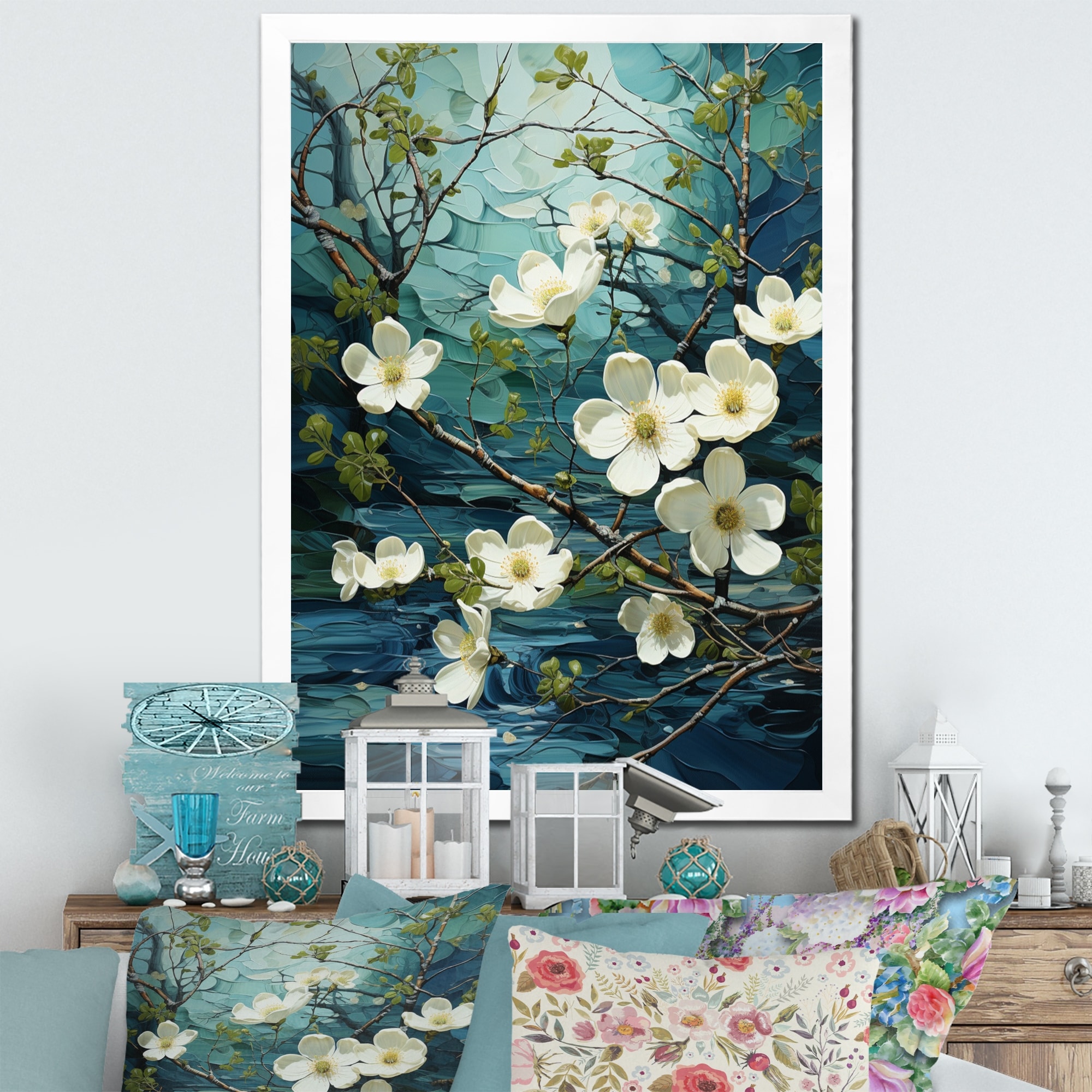 Designart "Teal White Dogwood Delight" Dogwood Framed Wall Decor