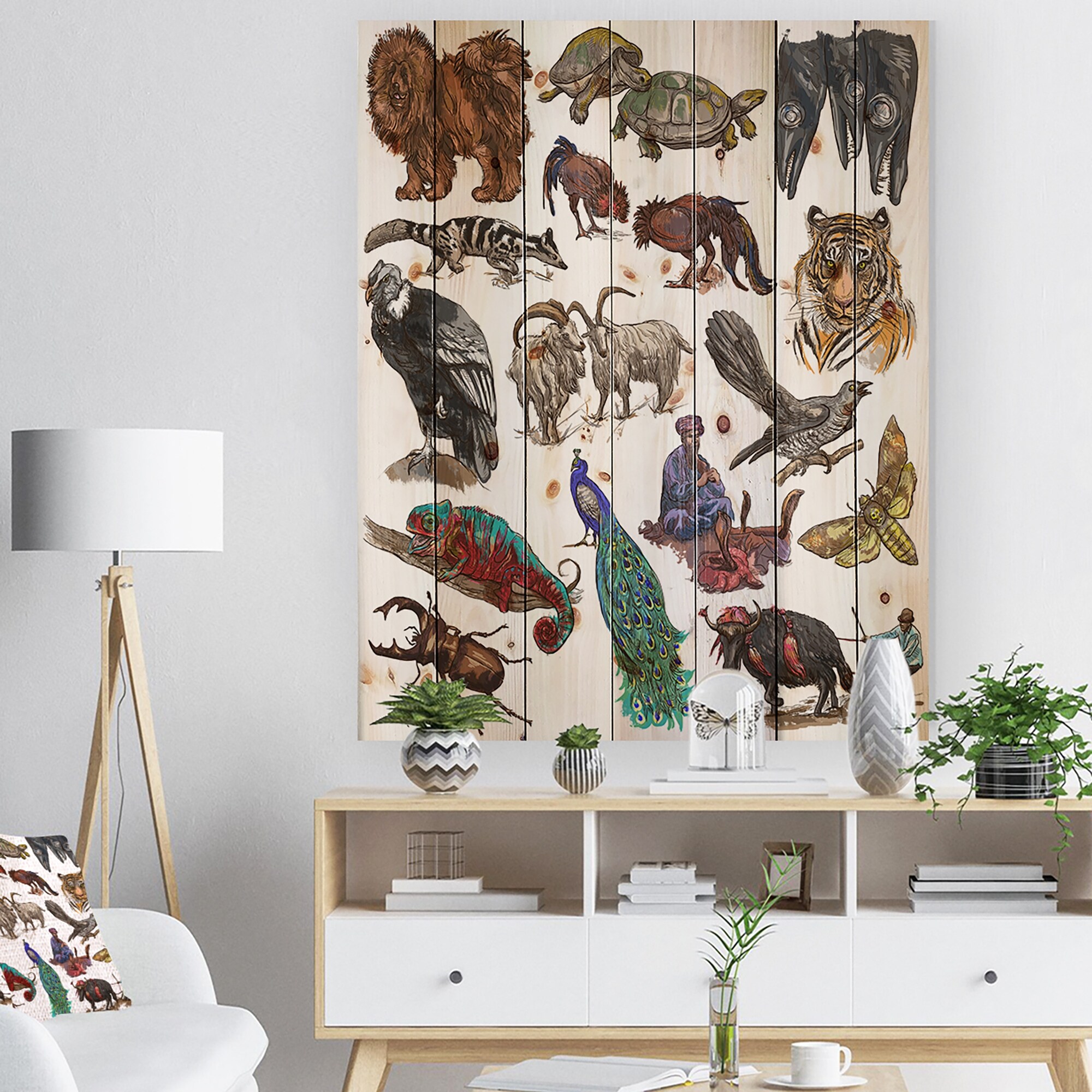 Designart 'Farmers in Freehand sketching' Sketch of Farmhouse Animals of Print on Natural Pine Wood - White