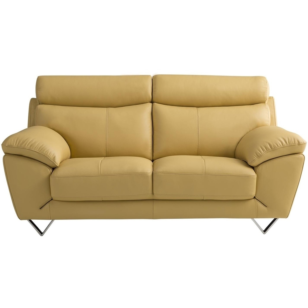 Leatherette Upholstered Wooden Loveseat with Plush Bustle Back and Steel Feet, Yellow