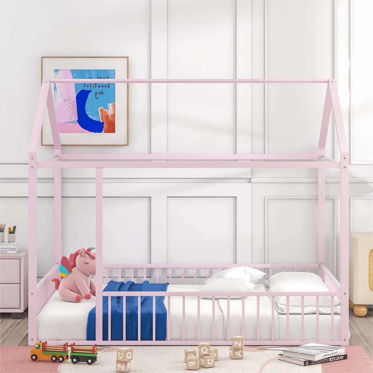 Toddler Floor Bed Full Size Metal Platform Bed with Fence & Door, Pink