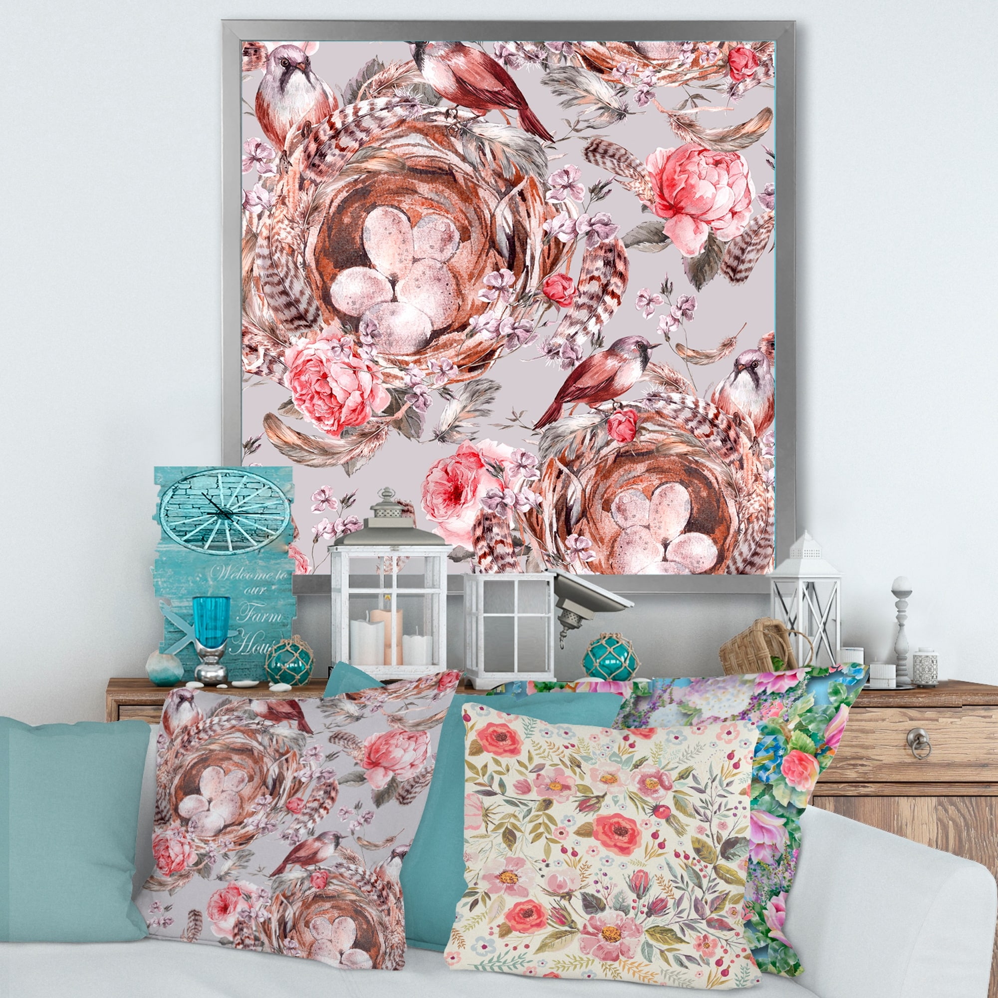 Designart "Vintage Pattern With Rose Birds Nests, Feathers I" Patterned Framed Art Print