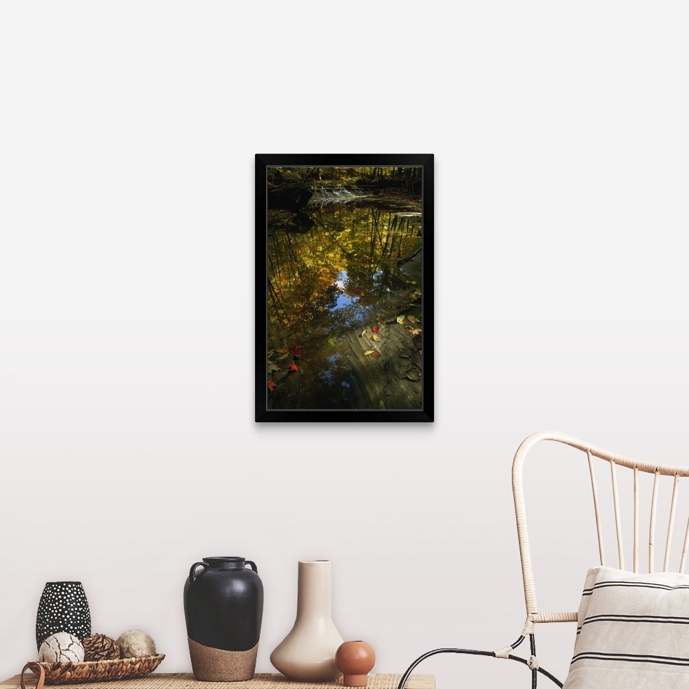 "Autumn color trees reflected in stream, Ohio" Black Framed Print