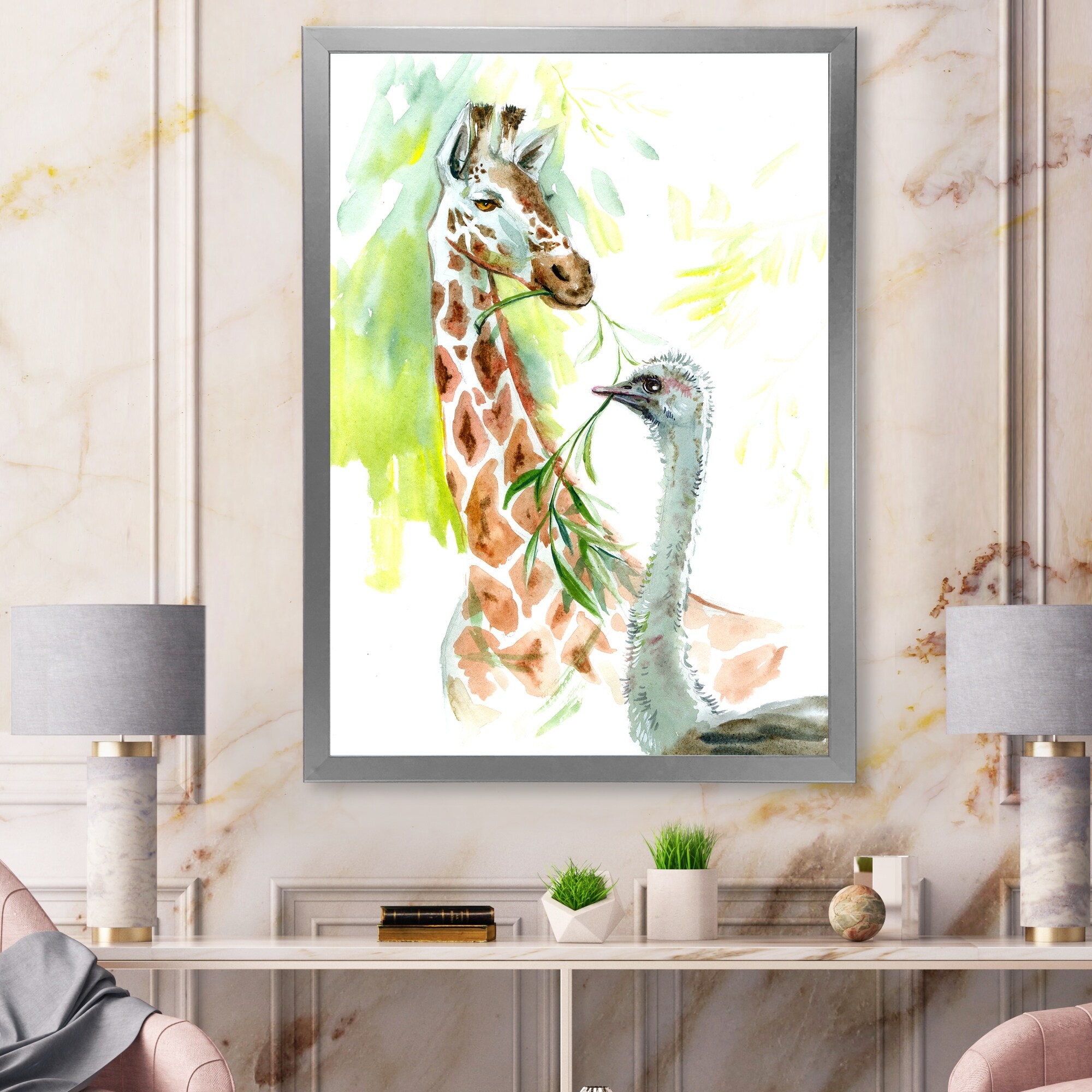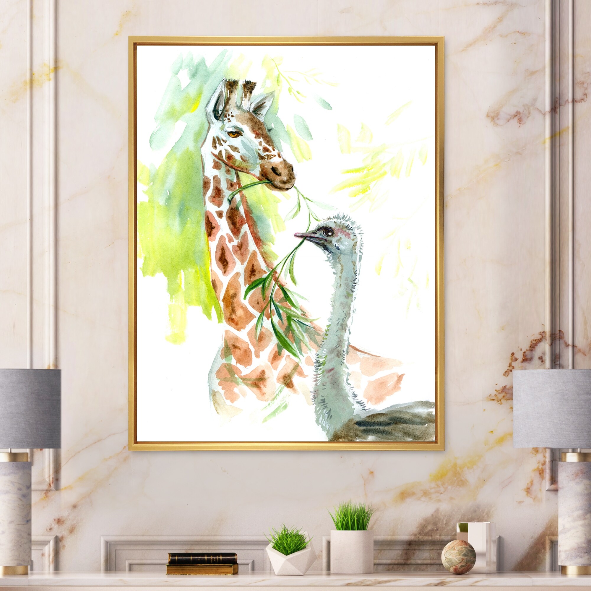 Designart "Portrait Of a Giraffe And an Ostrich" Traditional Framed Art Print