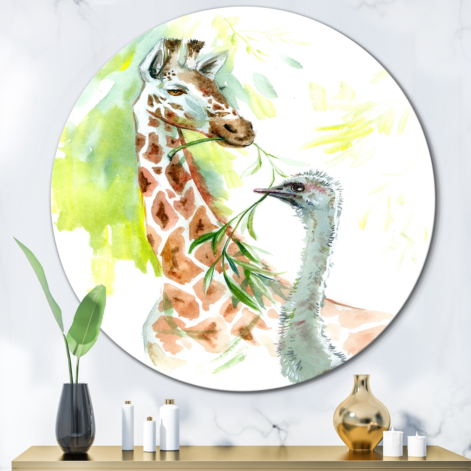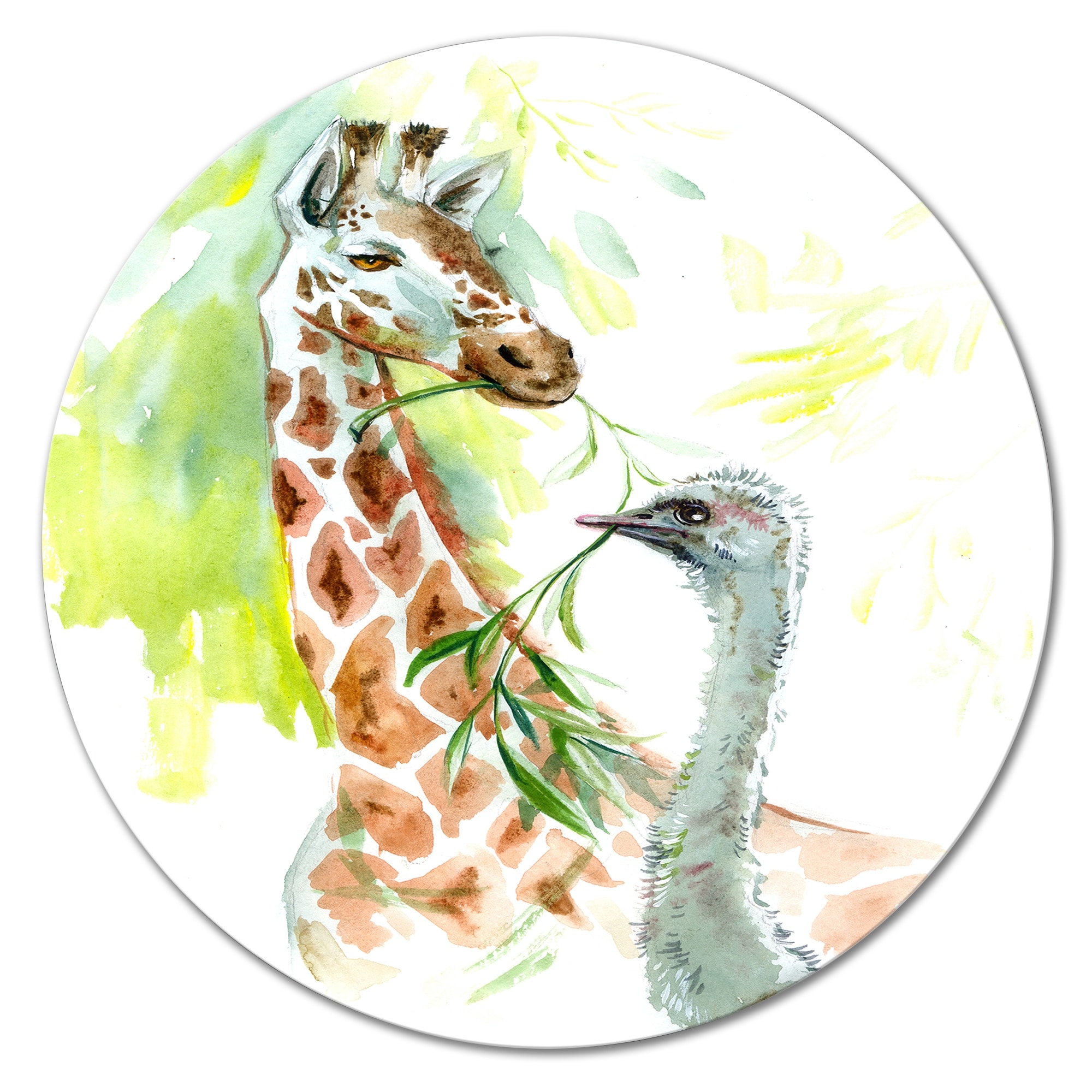 Designart 'Portrait Of a Giraffe And an Ostrich' Traditional Metal Circle Wall Art