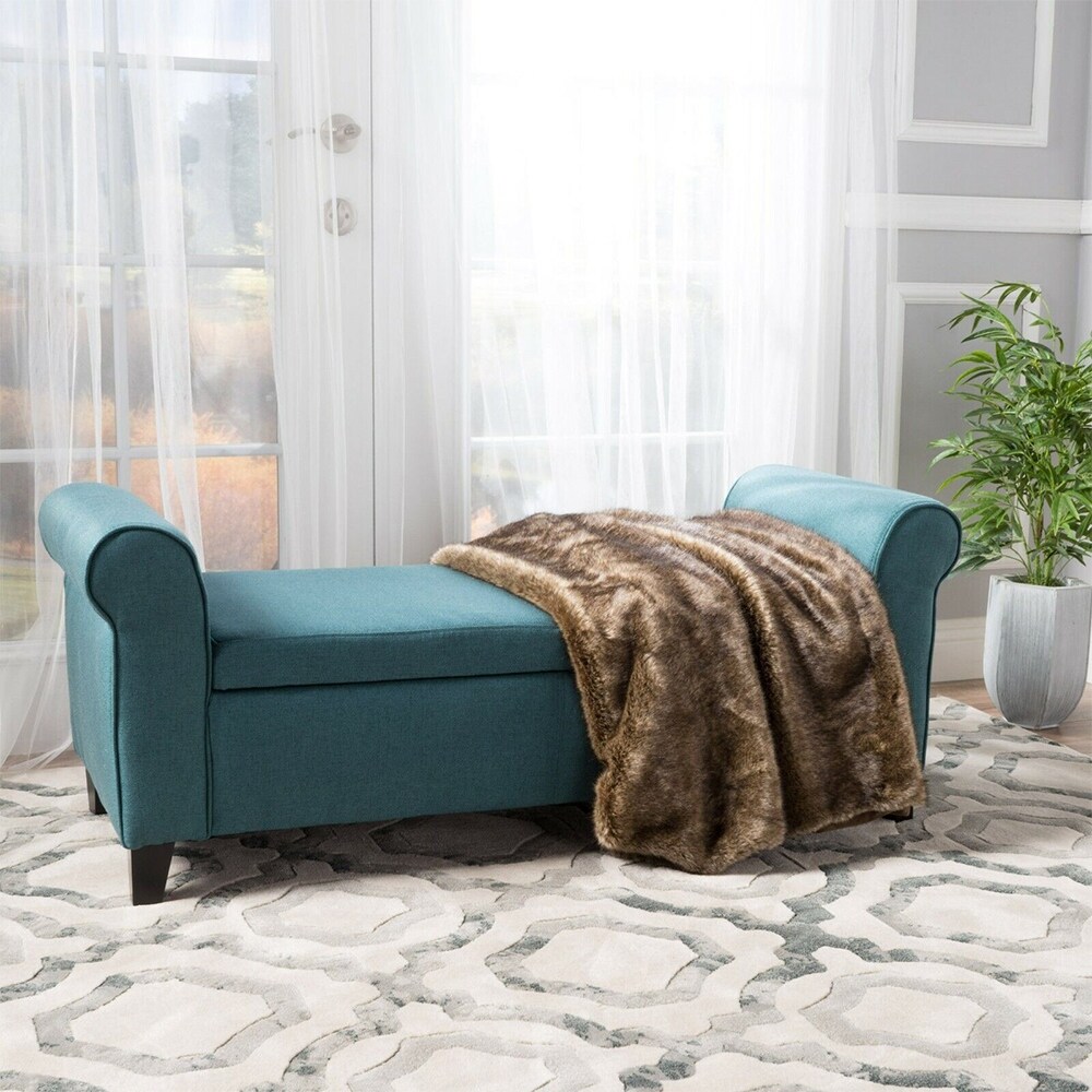 Fabric Upholstered Storage Ottoman Bench with Rolled Arm Dark Teal