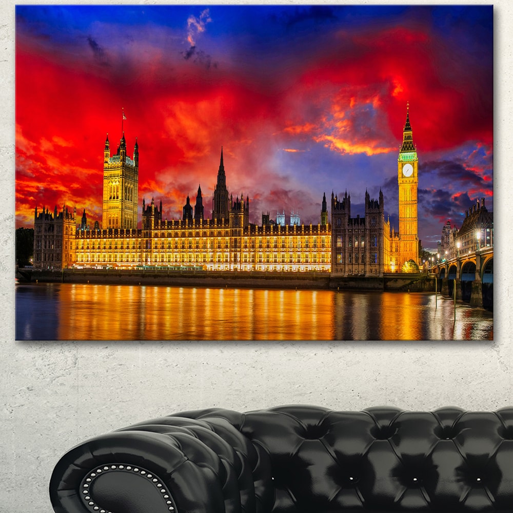 Designart "House of Parliament at River Thames" Modern Cityscape Canvas Art Print - Red