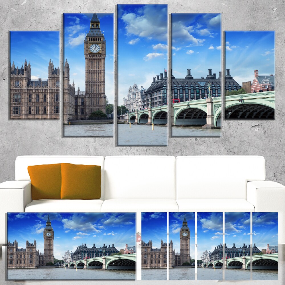 Designart "Houses of Parliament and Westminster Bridge" Modern Cityscape Canvas Artwork Print - Blue