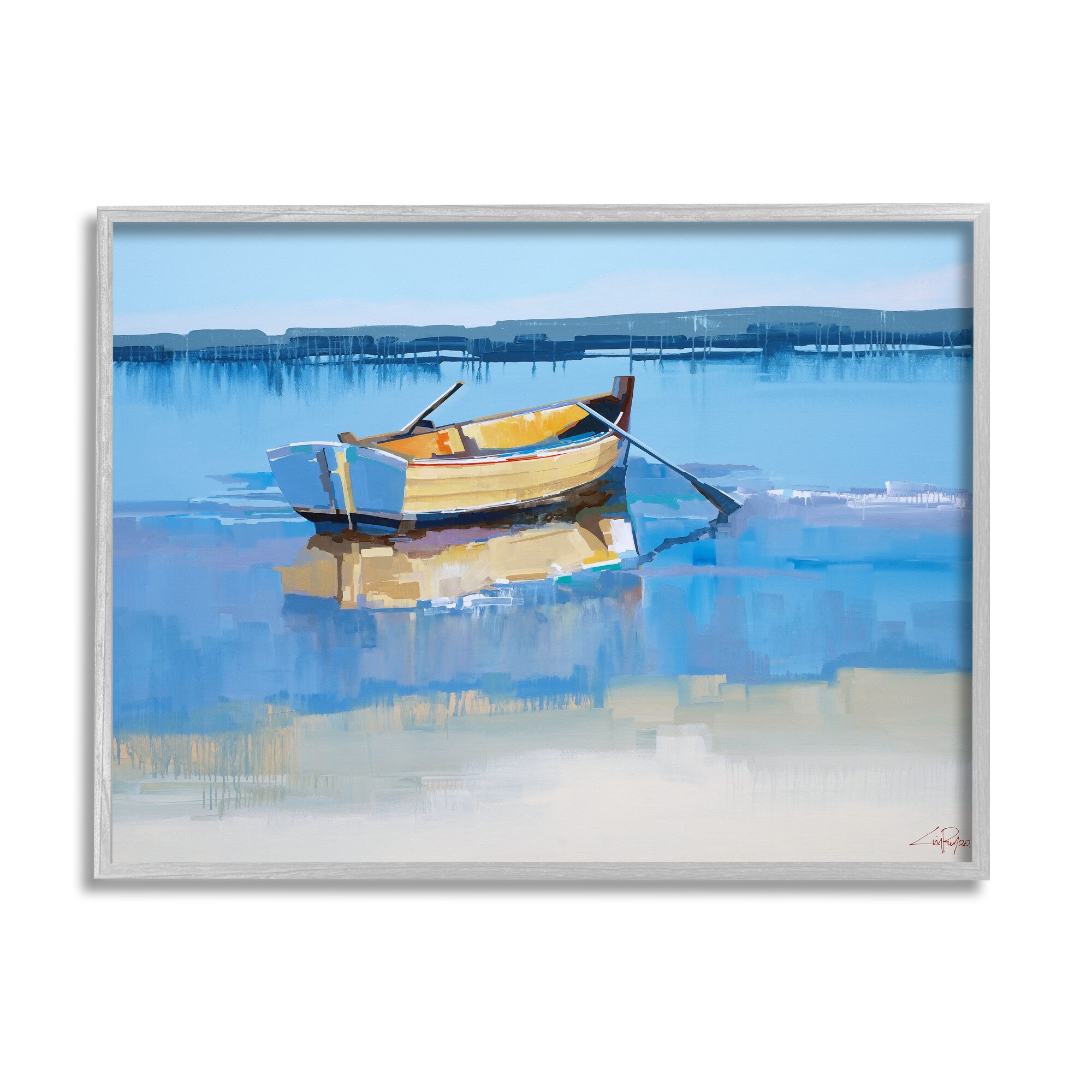 Stupell Industries Row Boat on Blue Coastal Shore Beach Landscape Framed Giclee Texturized Art by Craig Trewin Penny