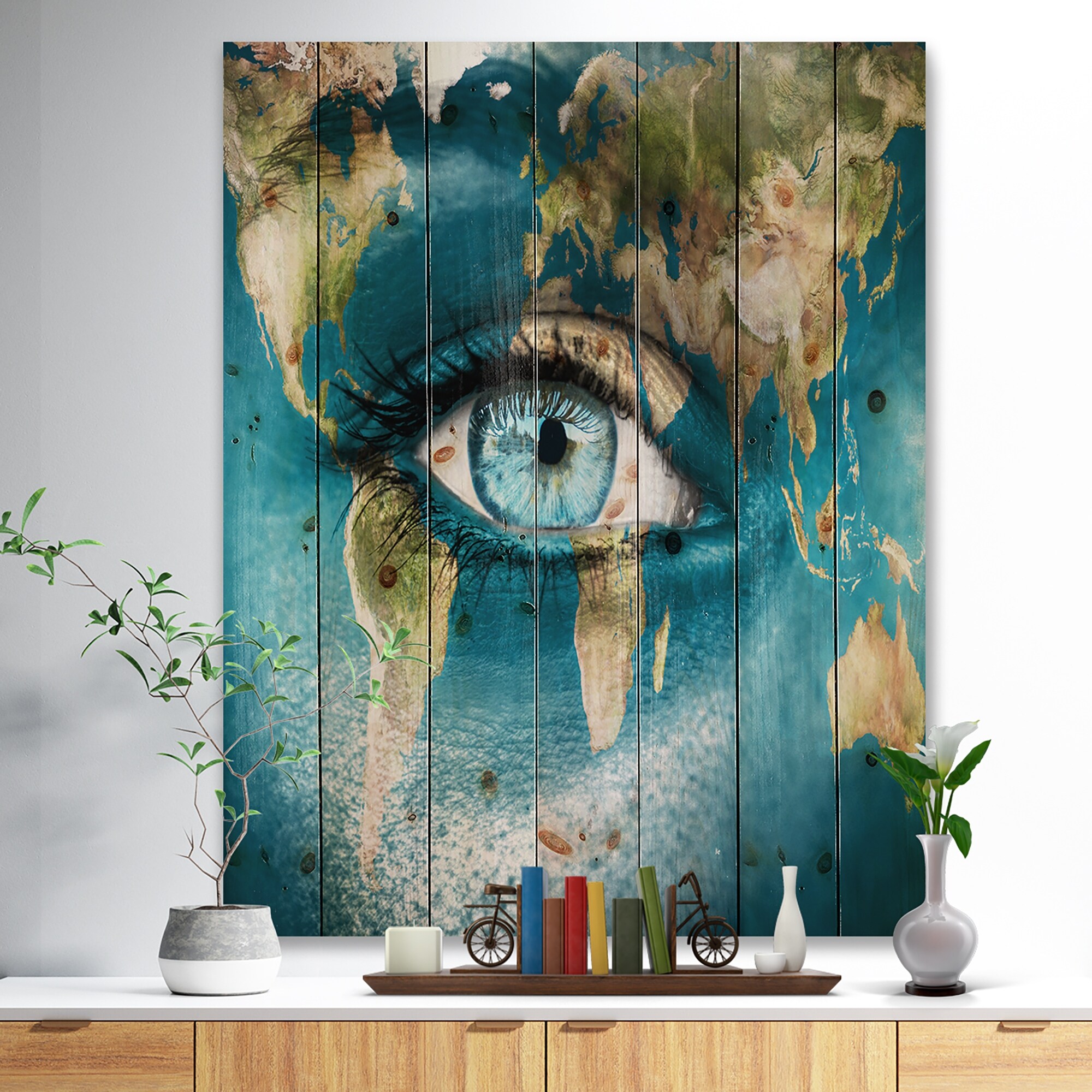 Designart 'Planet Earth and Blue Eye' Abstract Print on Natural Pine Wood