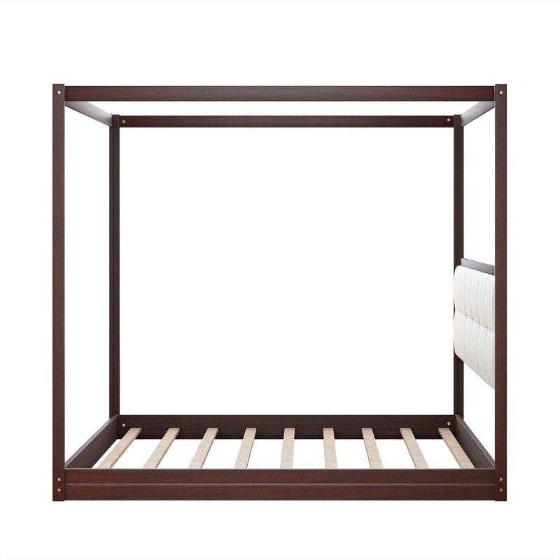 Queen Size Wooden Canopy Platform Bed with Upholstered Headboard, Espresso