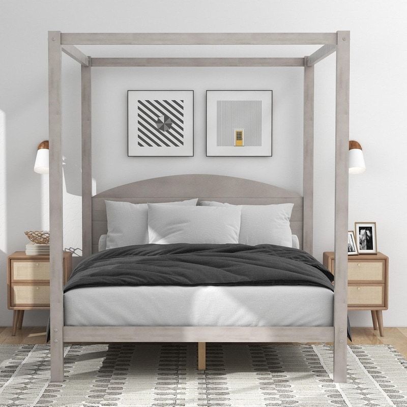 Queen / Full Size Wooden Canopy Platform Bed with Headboard and Support Legs