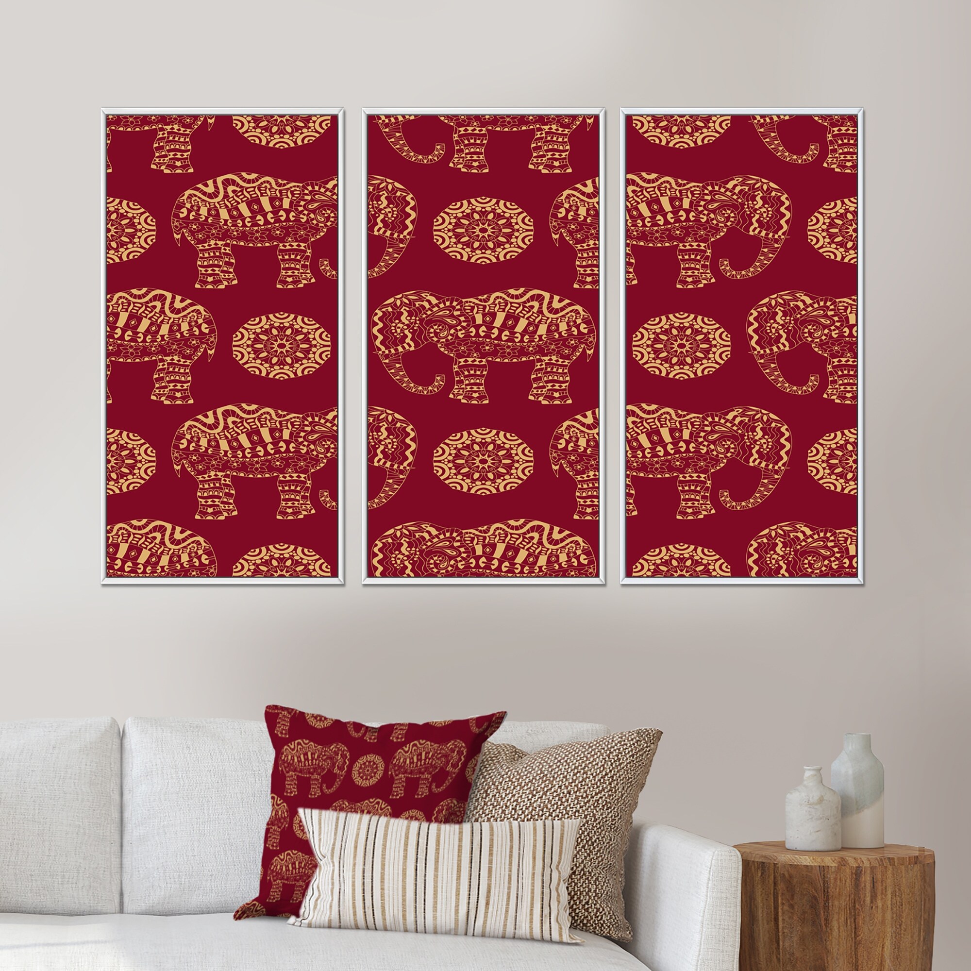 Designart "Indian Elephant And Mandala on REd" Patterned Framed Canvas Wall Art Print Set of 3 - 4 Colors of Frames