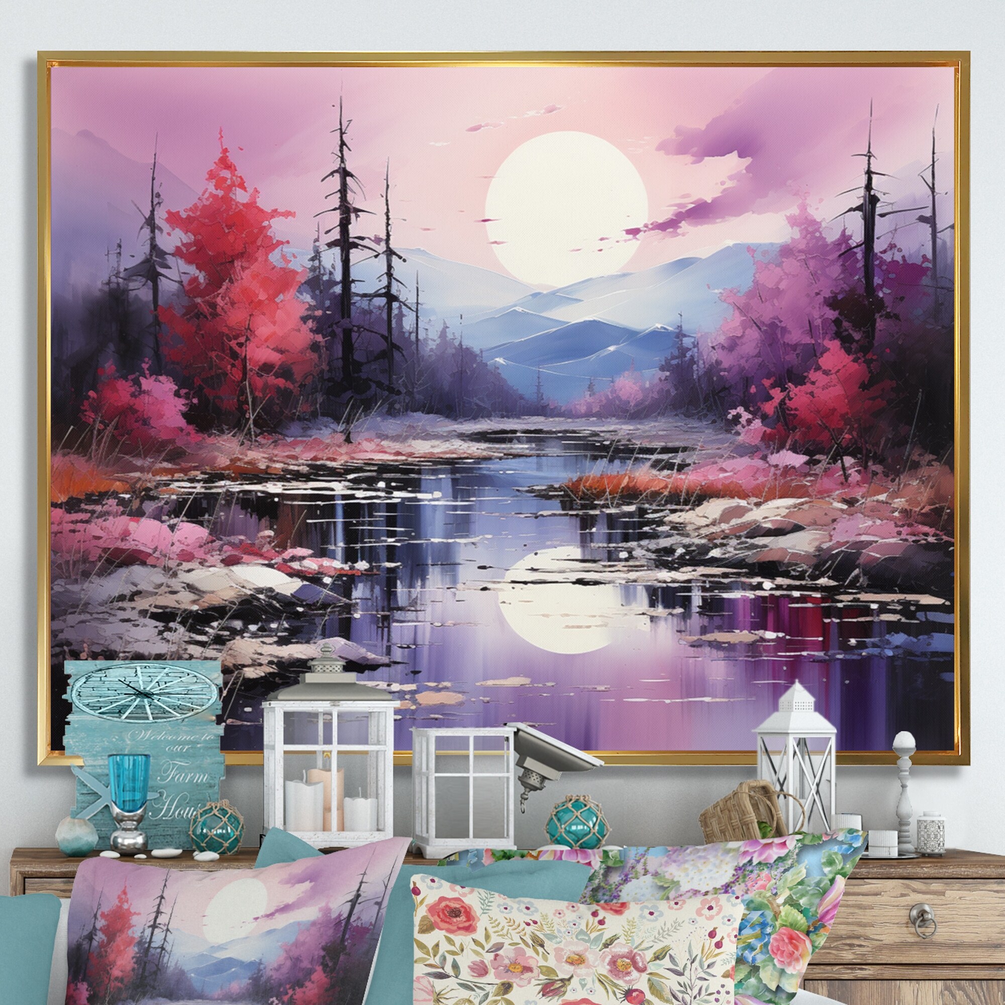 Designart "Pink Purple Riverside Serenity II" Lakes & Rivers Framed Wall Decor